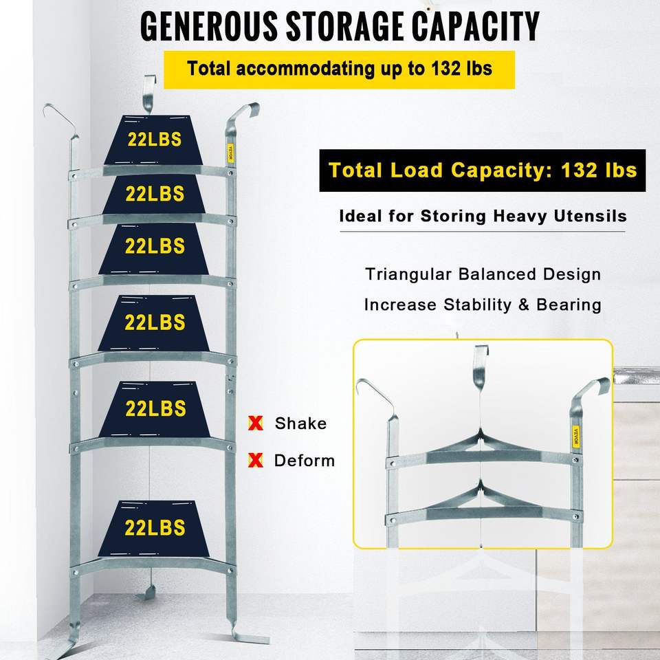 Stand per pentole a 6 livelli in acciaio al carbonio, raso e nichel, supporto per pentole multistrato da 61 pollici, non assemblato, mensola ad angolo cucina, ripiano pentole