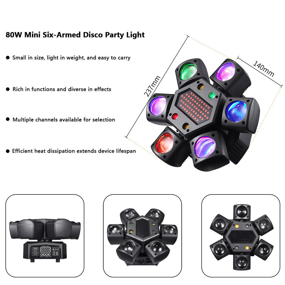 Faro mobile a 6 bracci Mini Beam 80W con effetto strobo, luci per feste, controllo remoto DMX512, per DJ, palcoscenici mobili, club e matrimoni