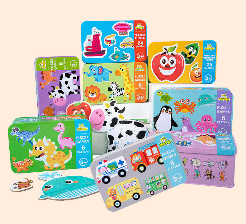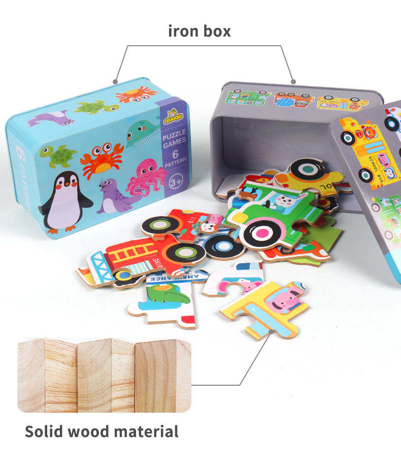 Puzzle 3D in Legno 6 in 1 con Disegni di Auto, Frutta e Animali in Scatola di Metallo, Gioco da Tavolo Educativo per Bambini e Bambine