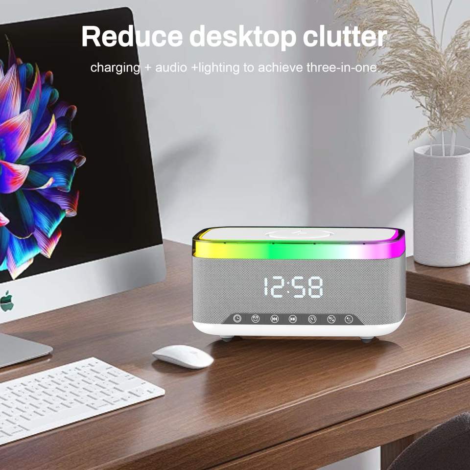Luce notturna 6-in-1 Radio sveglia 15W stazione di ricarica digitale orologio Wireless caricatore doppio altoparlante per camera da letto