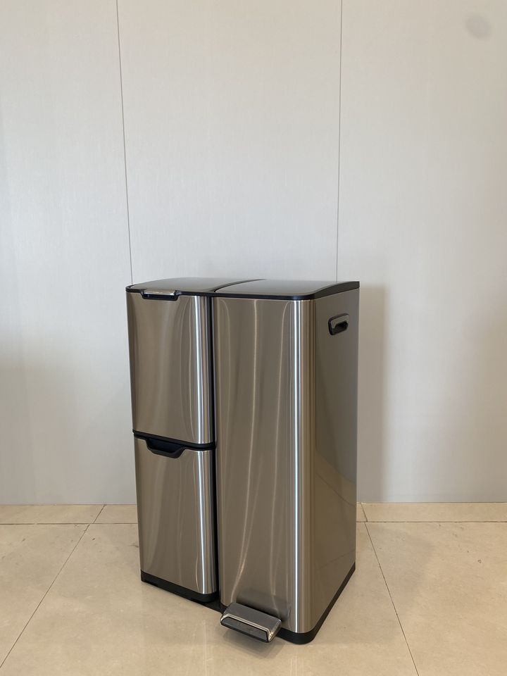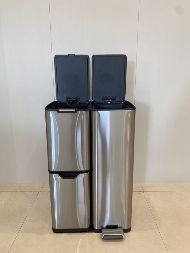 Design a tre scomparti: Facilita il riciclo e l'organizzazione dei rifiuti, rendendo la gestione dei rifiuti più organizzata ed efficiente.