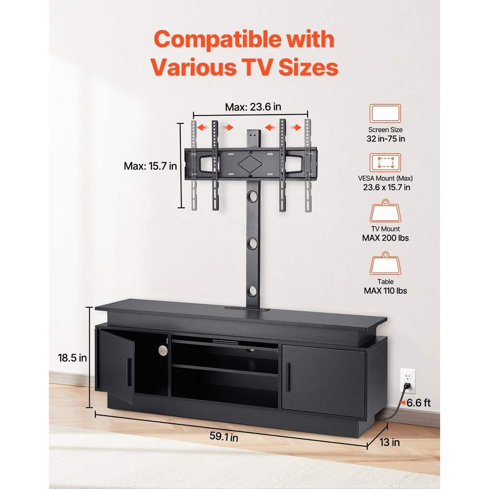 Mobile TV da 60 pollici con supporto per TV fino a 75 pollici, centro intrattenimento con presa di corrente, luci LED e altezza regolabile