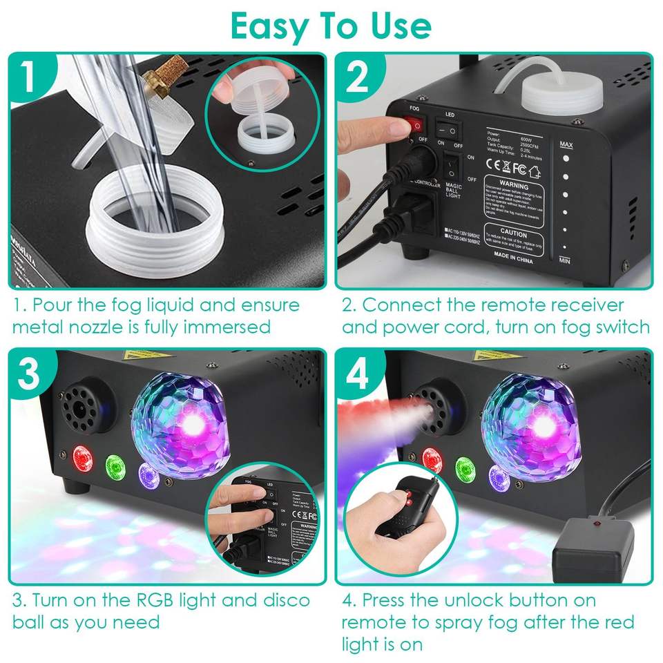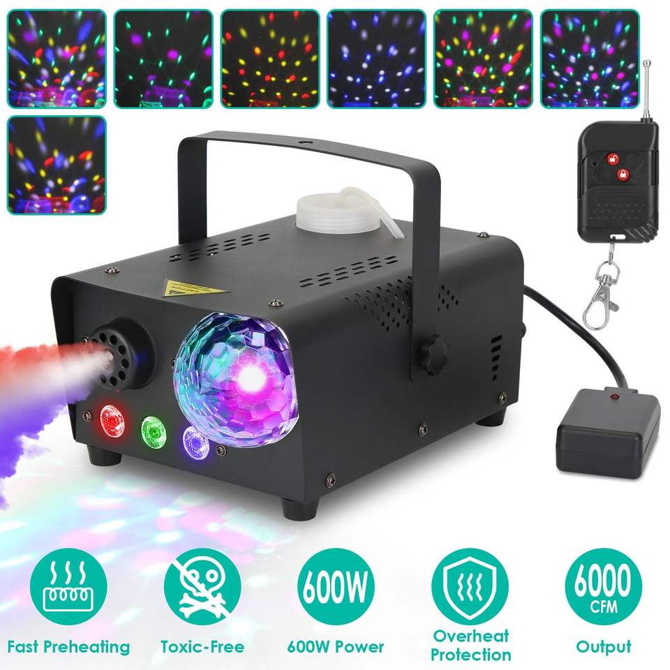 Macchina del fumo da 600W 6000CFM con telecomando wireless, sfera da discoteca RGB, 8 effetti di luce colorati, ghiaccio secco - 8000 ore di intrattenimento