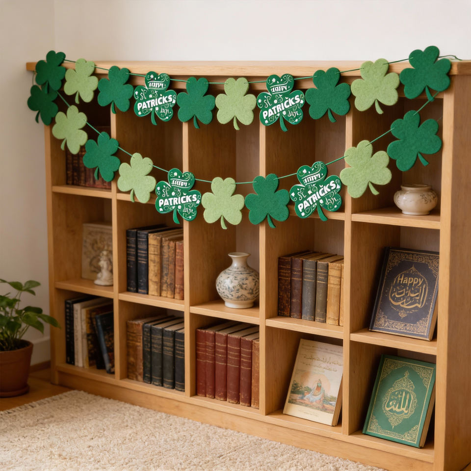 Ghirlanda per la festa di San Patrizio: trifoglio in feltro e striscione con scritta "Buon San Patrizio" per decorazioni festive