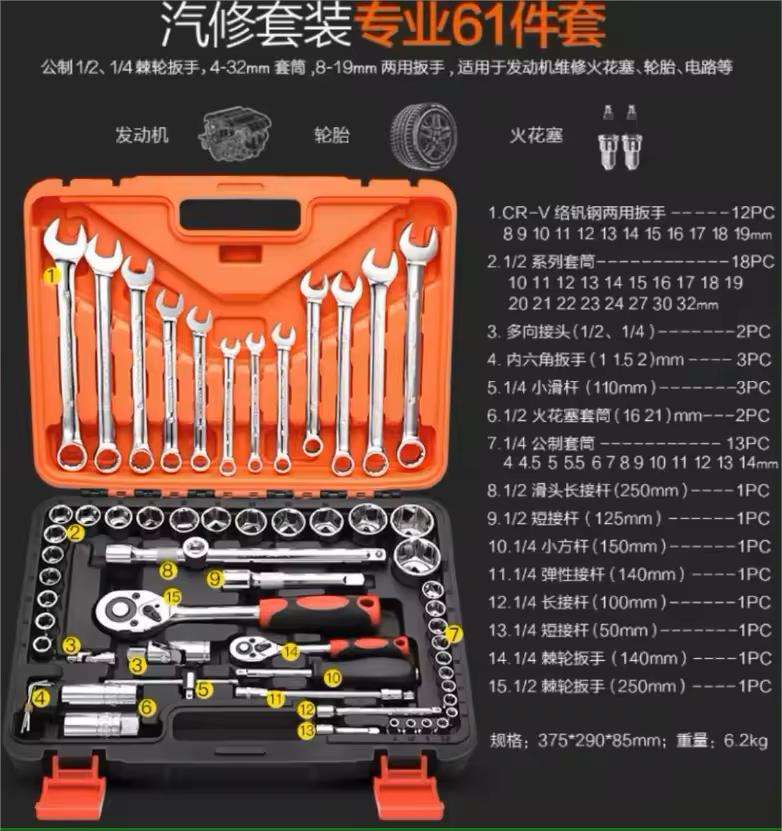 Scatola di strumenti per la riparazione di macchine cromate da 61 pezzi Herramientas combinazione Hardware fornisce chiavi chiave a cricchetto Set scatola