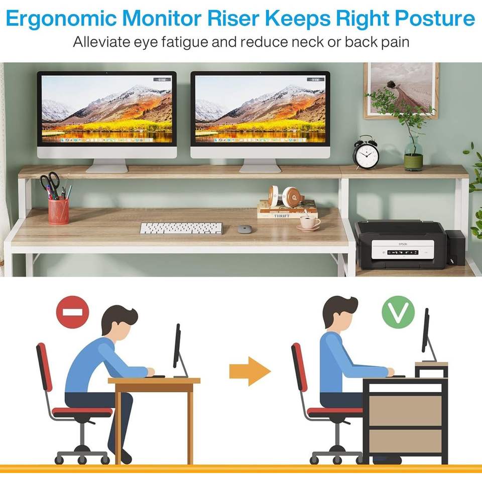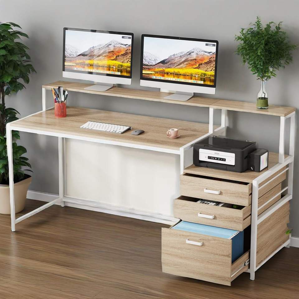 Scrivania Ergonomica da Ufficio da 63 Pollici con Supporto Monitor, Tavolo Industriale per Computer Stampato con Cassettiera Portadocumenti