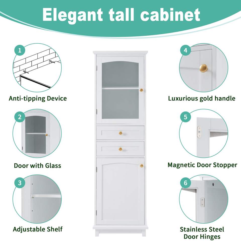 Mobiletto da Bagno Autoportante Alto 63 Pollici con Due Cassetti Regolabili, Ante in Vetro, Pannello in MDF Verniciato Bianco, Due Cassetti