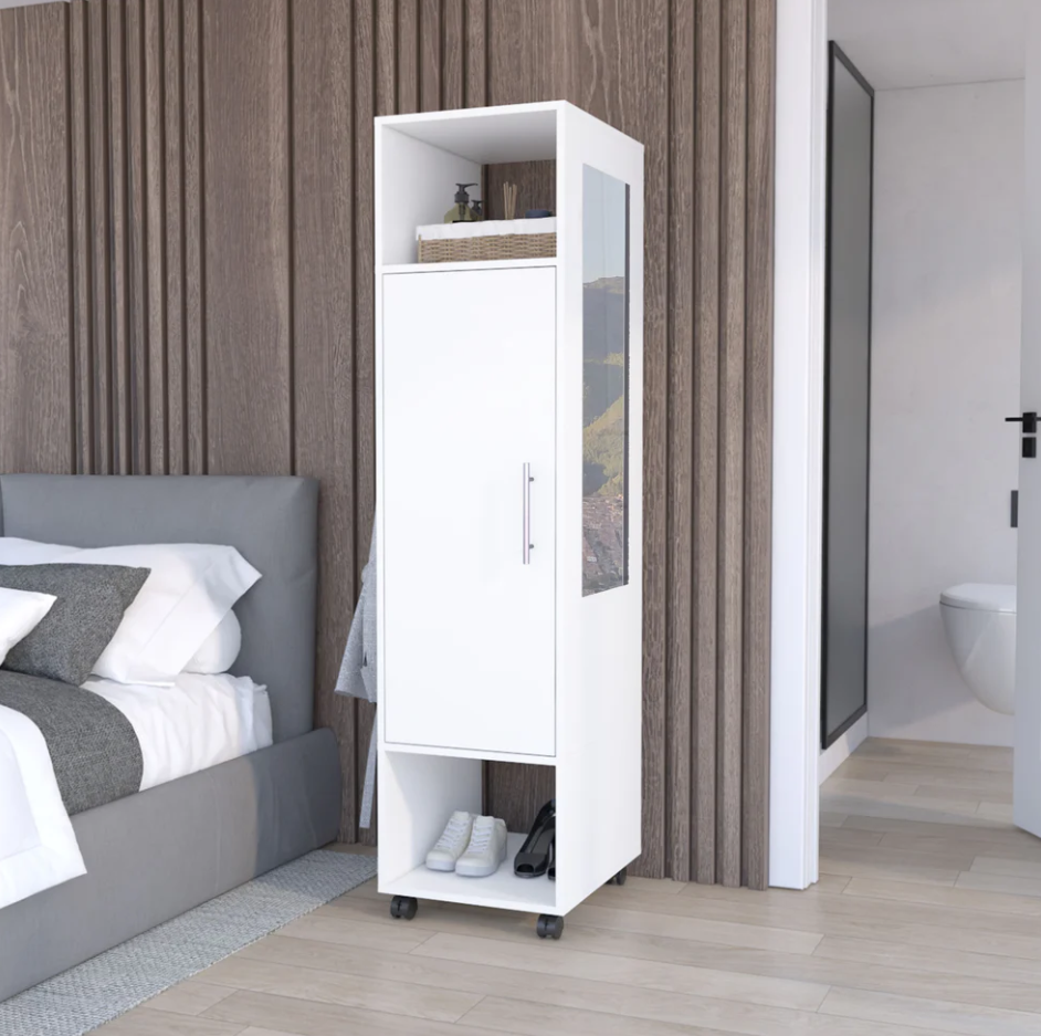 63" Tall Wardrobe One Door Cabinet with Mirror & Three Shelves & Casters Armoire with Bedroom Clothes Storage Cabinet Organizer