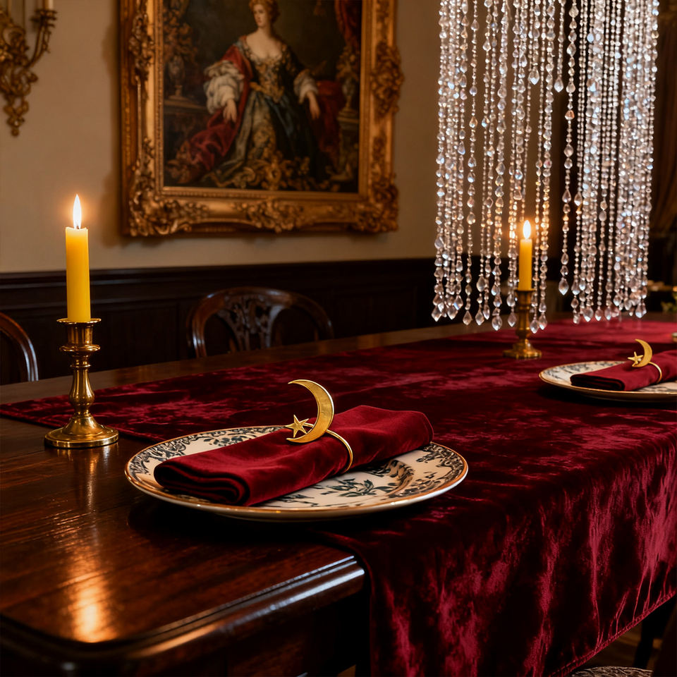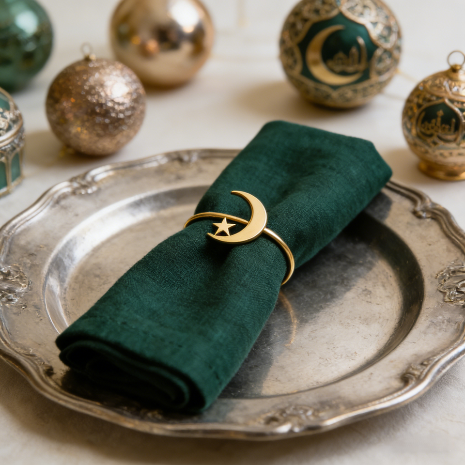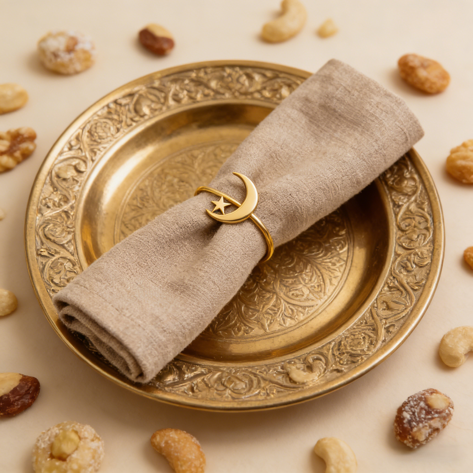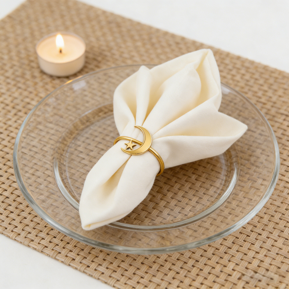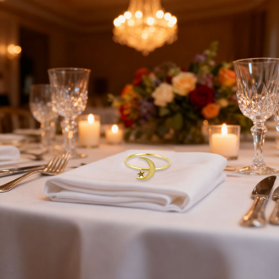 631784 Portatovaglioli Luna e Stelle - Decorazione in Metallo Dorato a Forma di Luna Crescente con Stella Nera, per Ramadan e Allestimento Tavola Festiva