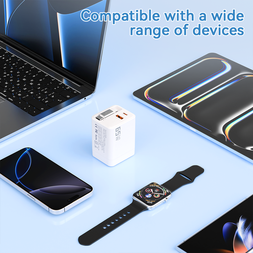 Nome del prodotto:Il caricabatterie GaN a 3 porte da 65 W viene fornito con cavo