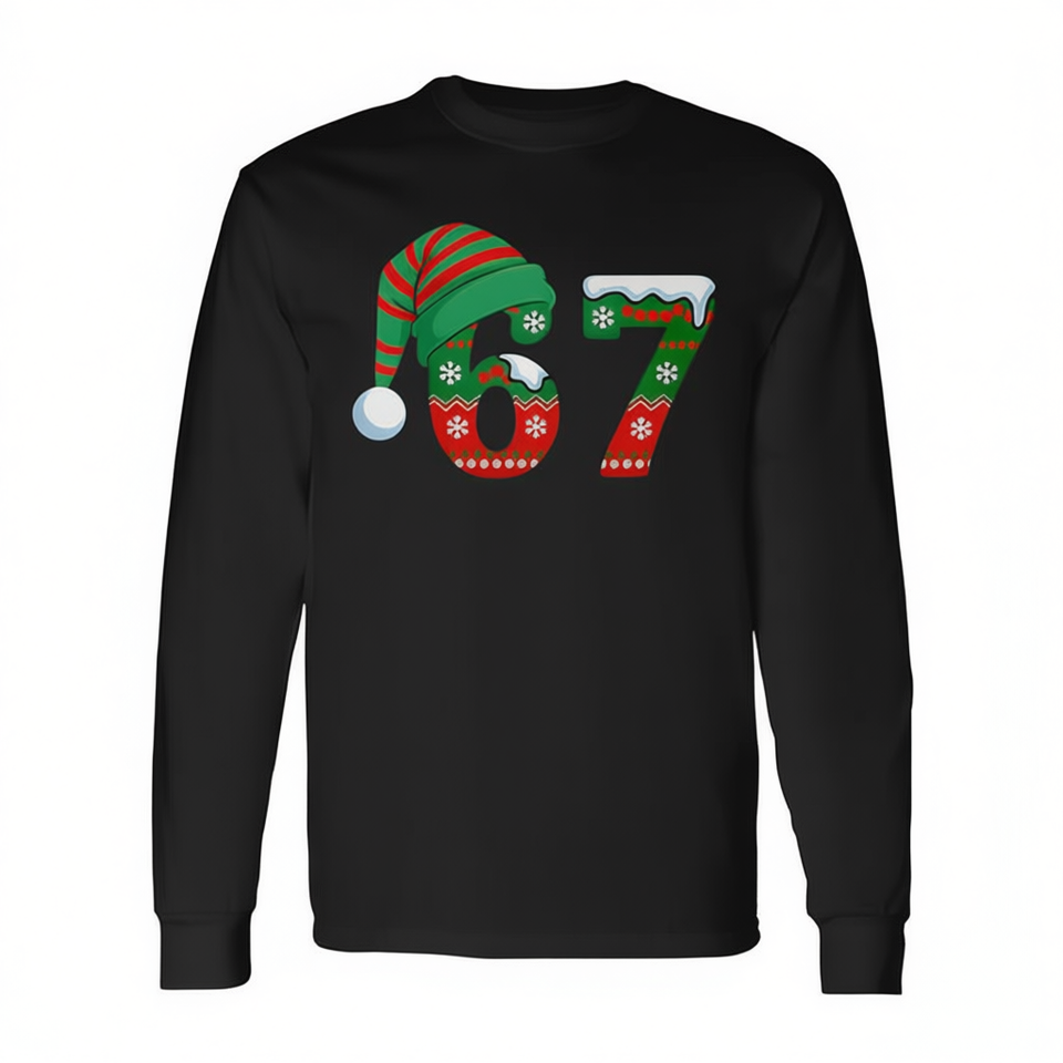67 Christmas Six Seven Meme Brainrot T-shirt a maniche lunghe con cappello da Babbo Natale