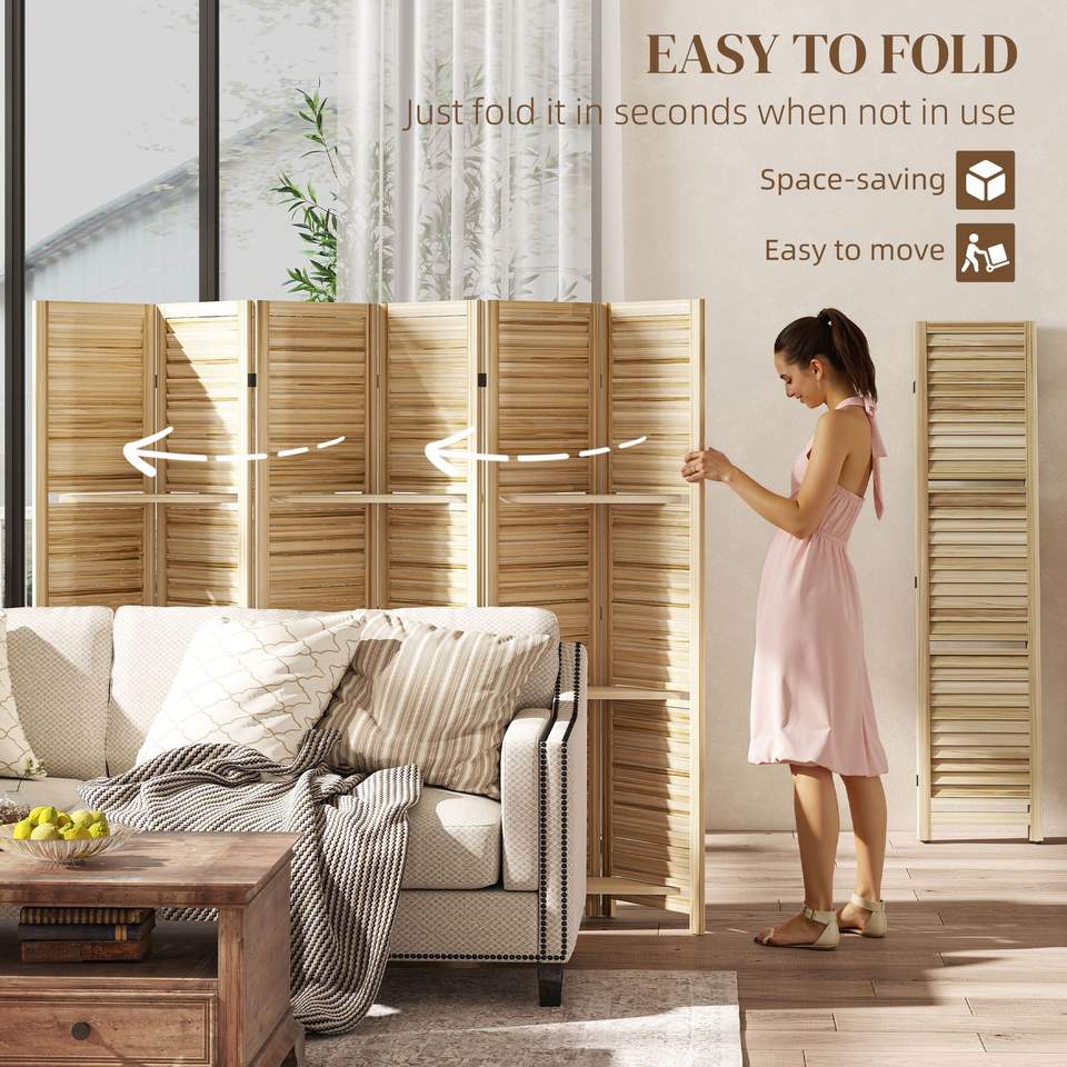 Paravento Divisorio in Legno Naturale Alto 170 cm con 3 Ripiani e Vano Pieghevole, Schermo a 6 Pannelli per Camera da Letto