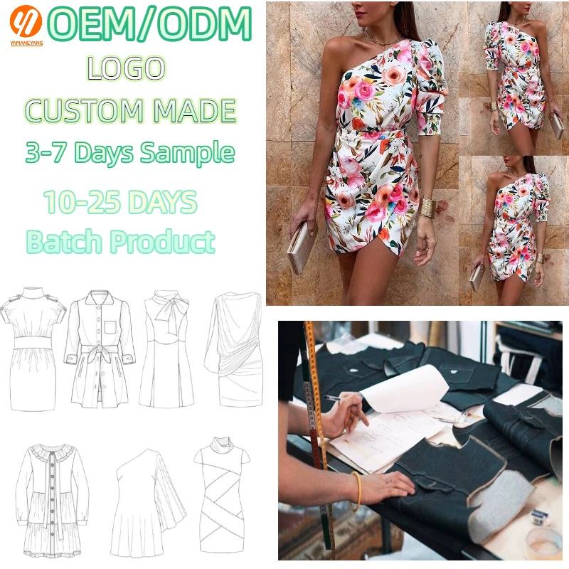 68 Abito Mini Floreale Monospalla Personalizzato ODM OEM con Maniche a Sbuffo e Dettagli Drappeggiati, Vestito Floreale Aderente per Feste e Serate Eleganti Sexy