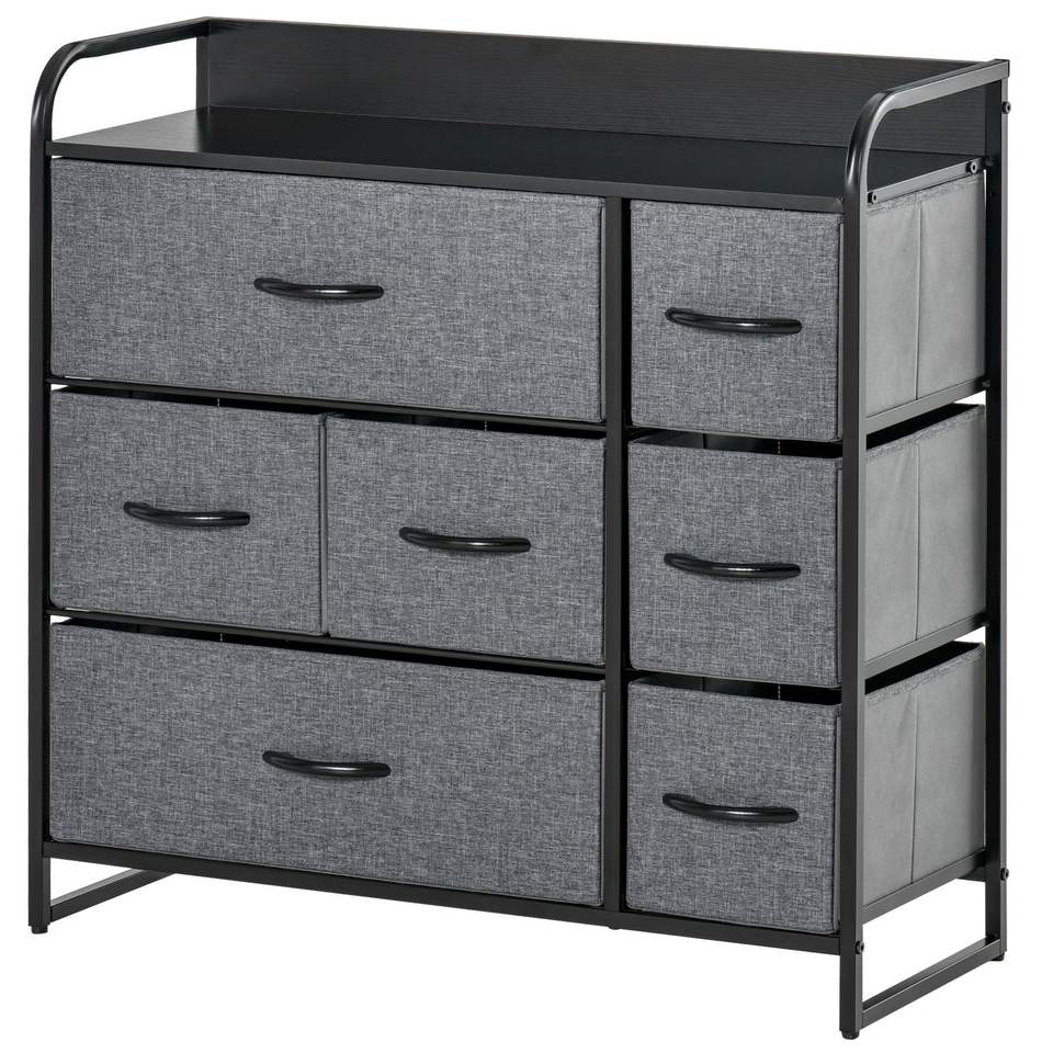 Comò grigio a 7 cassetti con struttura in acciaio e scrigno in tessuto in legno per riporre in camera da letto o in corridoio