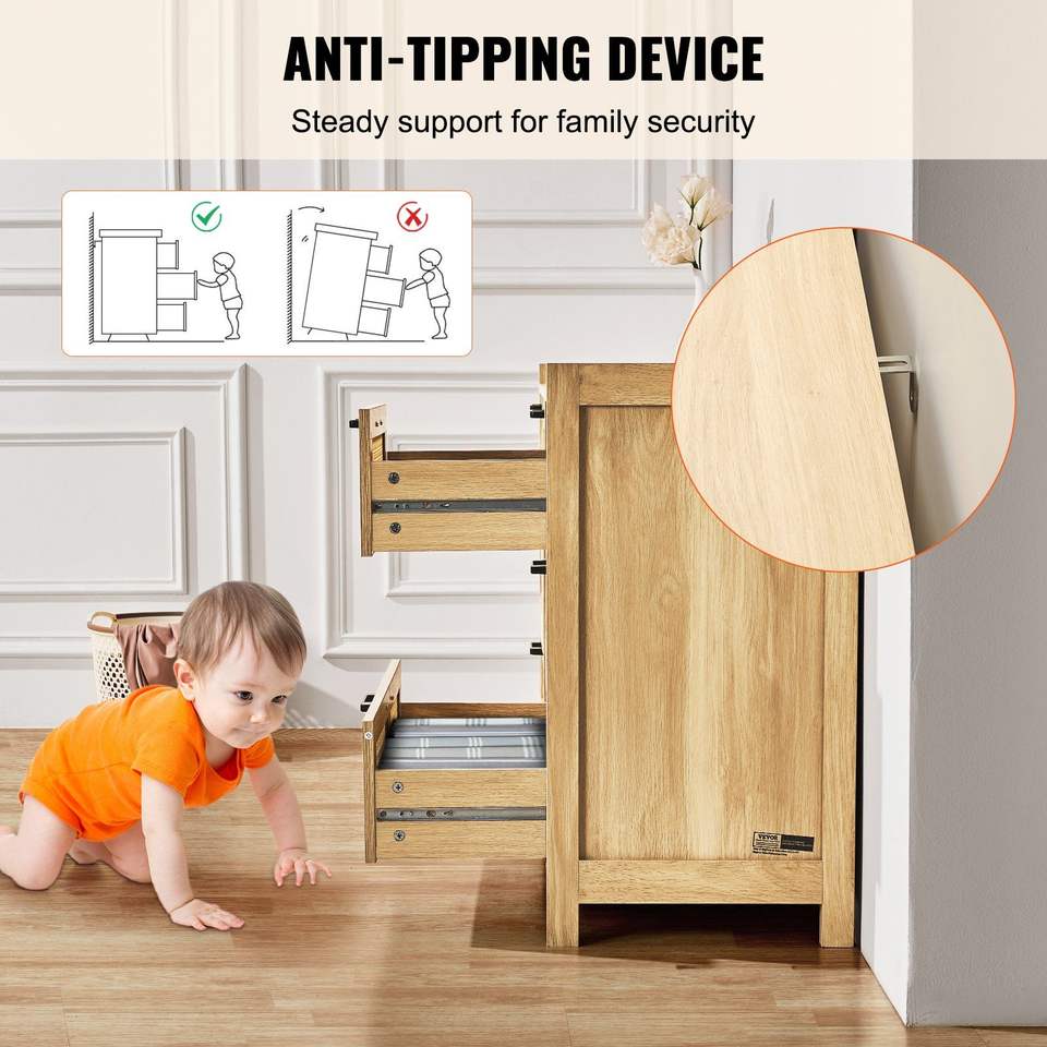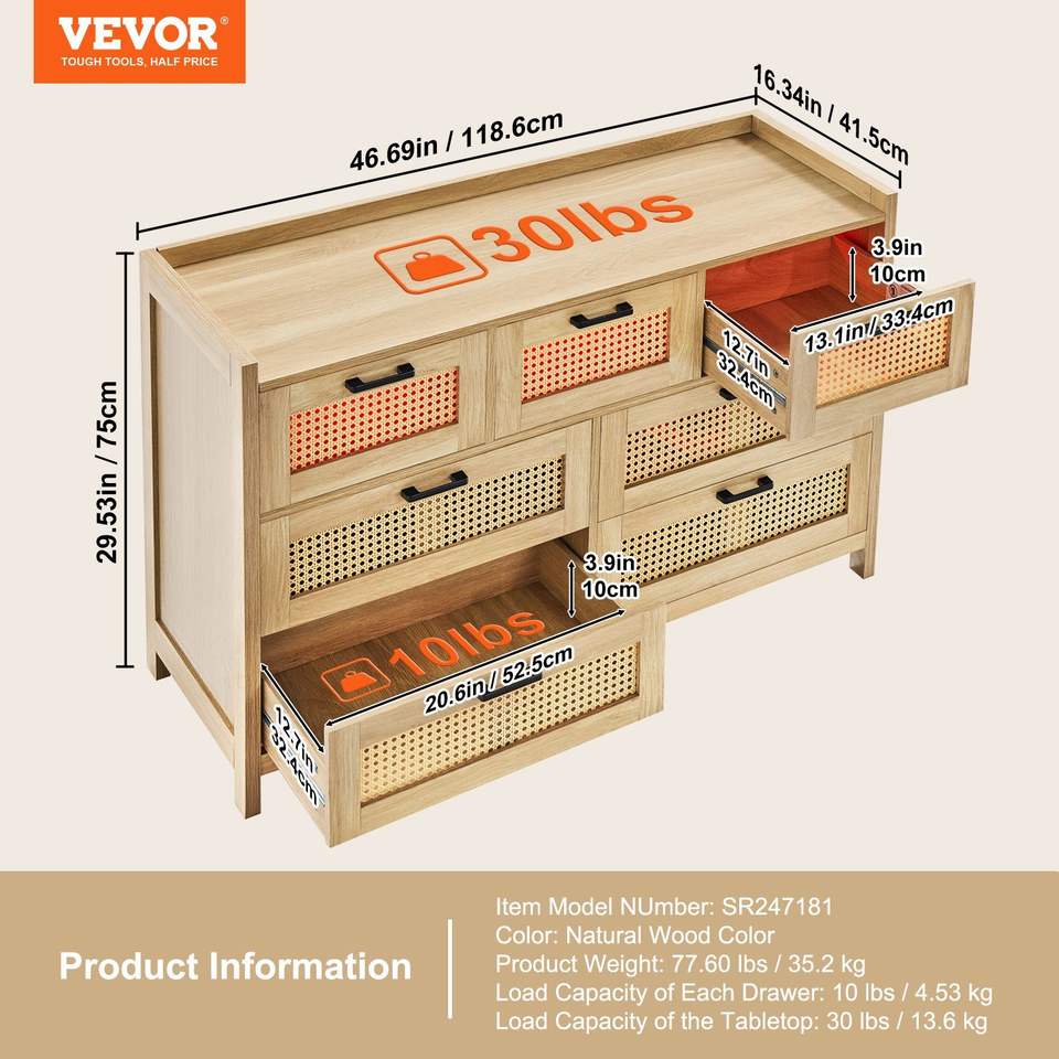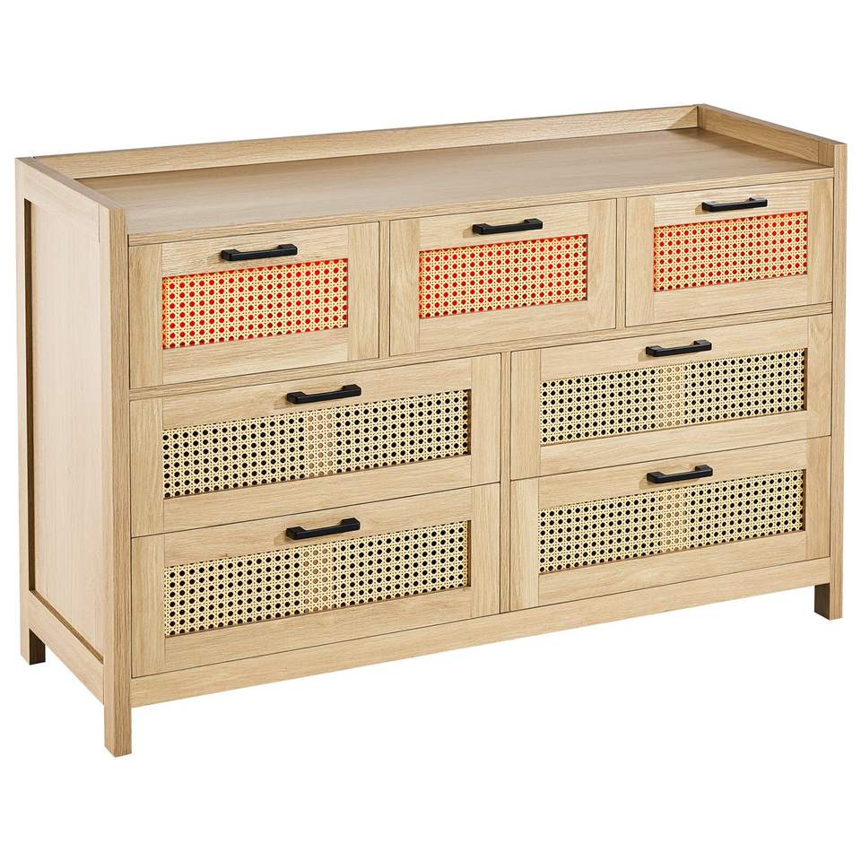Comò Moderno Boho a 7 Cassetti in Legno Naturale Burlywood con Organizer e Luci LED per la Conservazione dei Vestiti