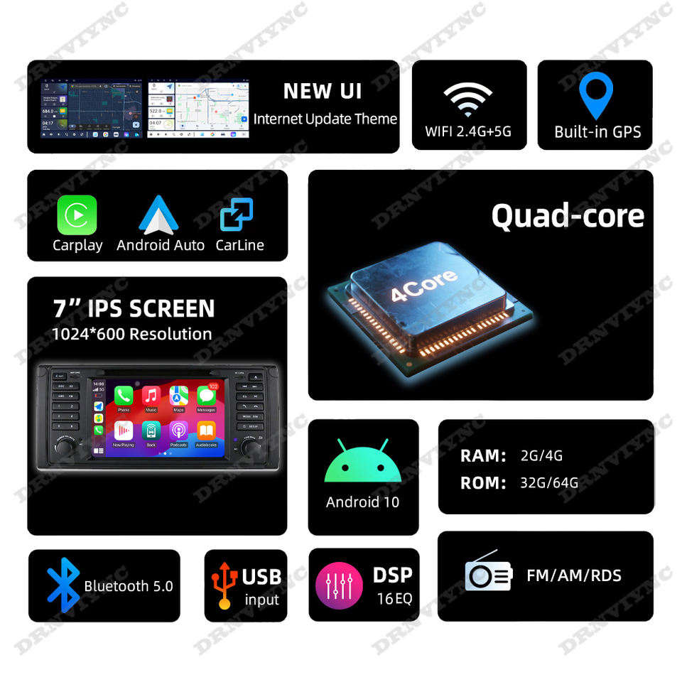 7 Inch Android Car Radio CarPlay Stereo Video Player Screen GPS Navigation 2Din Headunit for BMW E39 E53