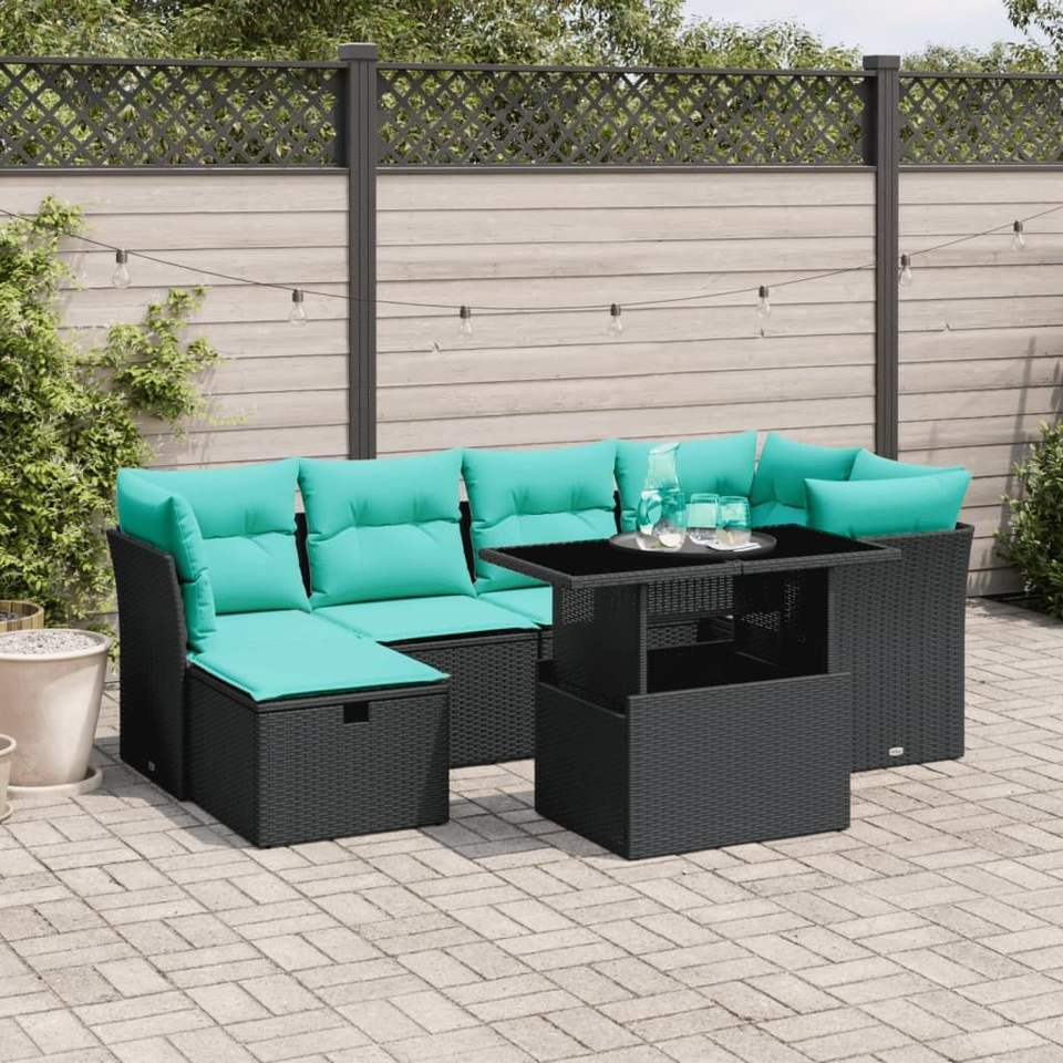 Set Divano da Giardino in Polyrattan Nero con Cuscini, 7 Pezzi, Arredamento da Esterno Stile Contemporaneo per Giardino, Capacità 6 Posti