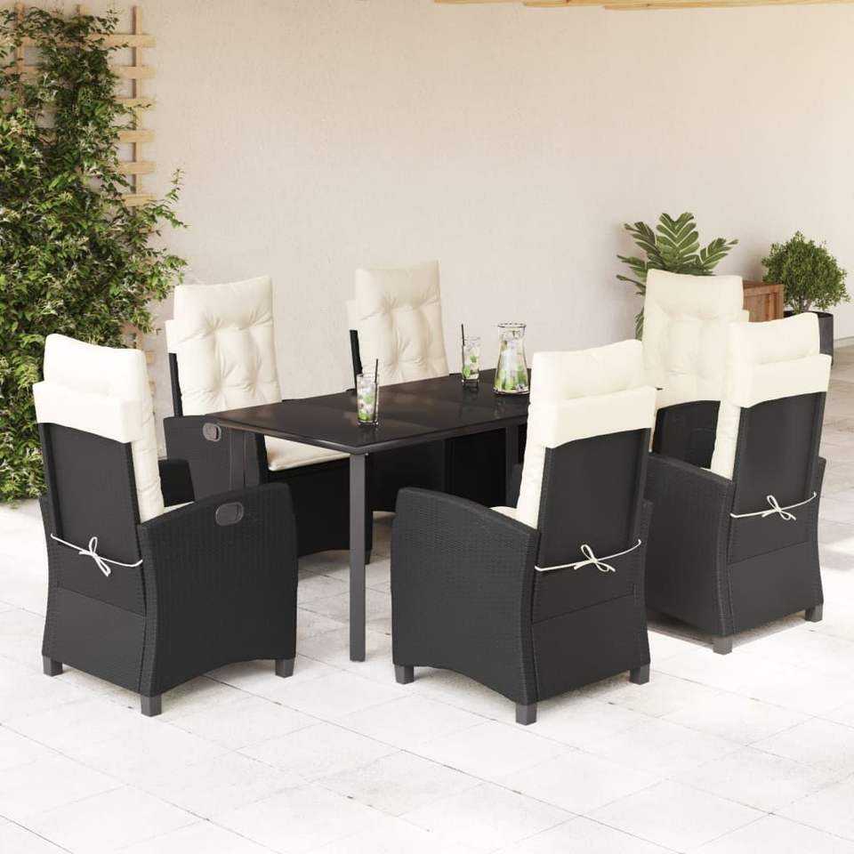 Set da pranzo da 7 pezzi in Poly Rattan nero con cuscini Set da giardino