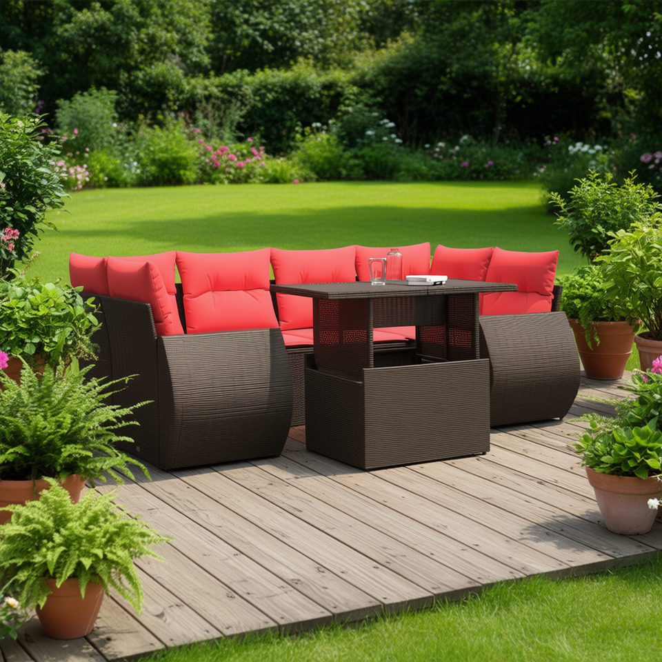 Set di divani da giardino in polyrattan marrone da 7 pezzi con cuscini, mobili da esterno dal design contemporaneo