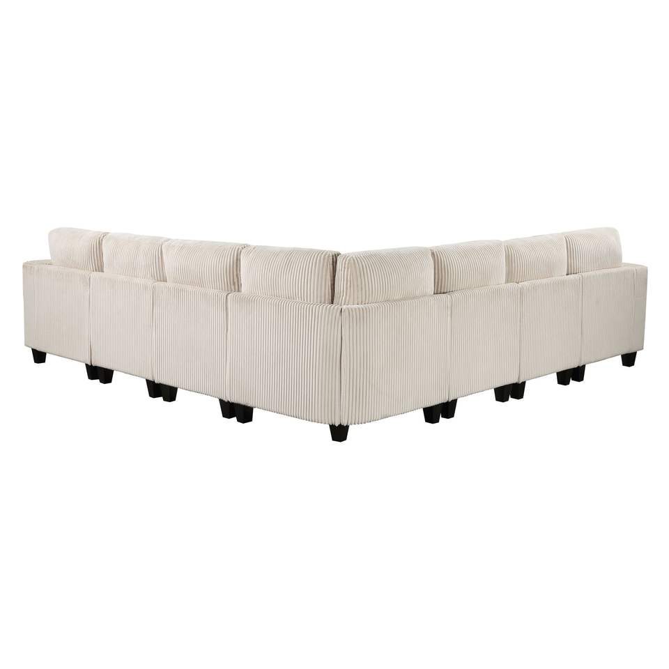 7-Piece Modern Beige Corduroy Fabric Living Room Sectional Couch Solid Wood Furniture Storage Seats Side Pockets Charging Ports