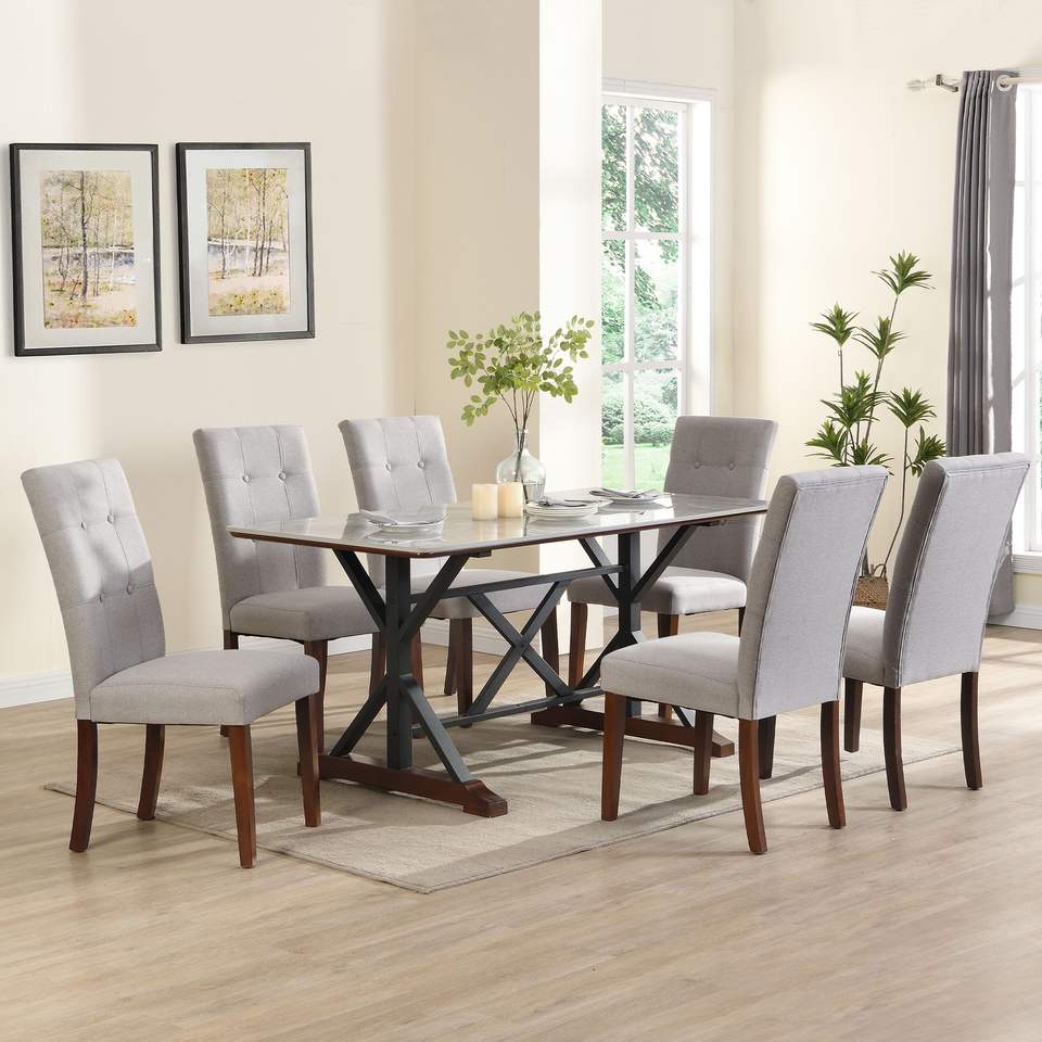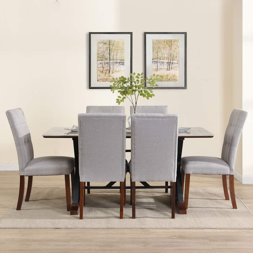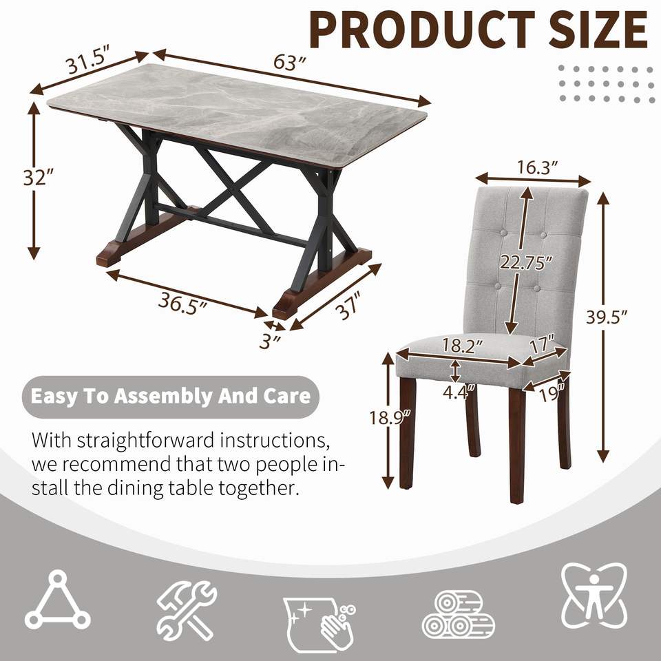 Set da Pranzo Moderno in Pietra Sinterizzata Grigia con 7 Pezzi: Tavolo Rettangolare da 63 Pollici e 6 Sedie Imbottite Trapuntate