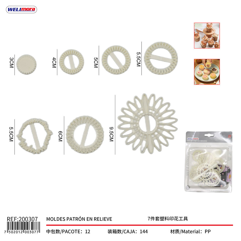 Set di 7 tagliabiscotti in plastica Welimora con motivo a rilievo per decorazioni di pasticceria, forme rotonde da 3-9,5 cm