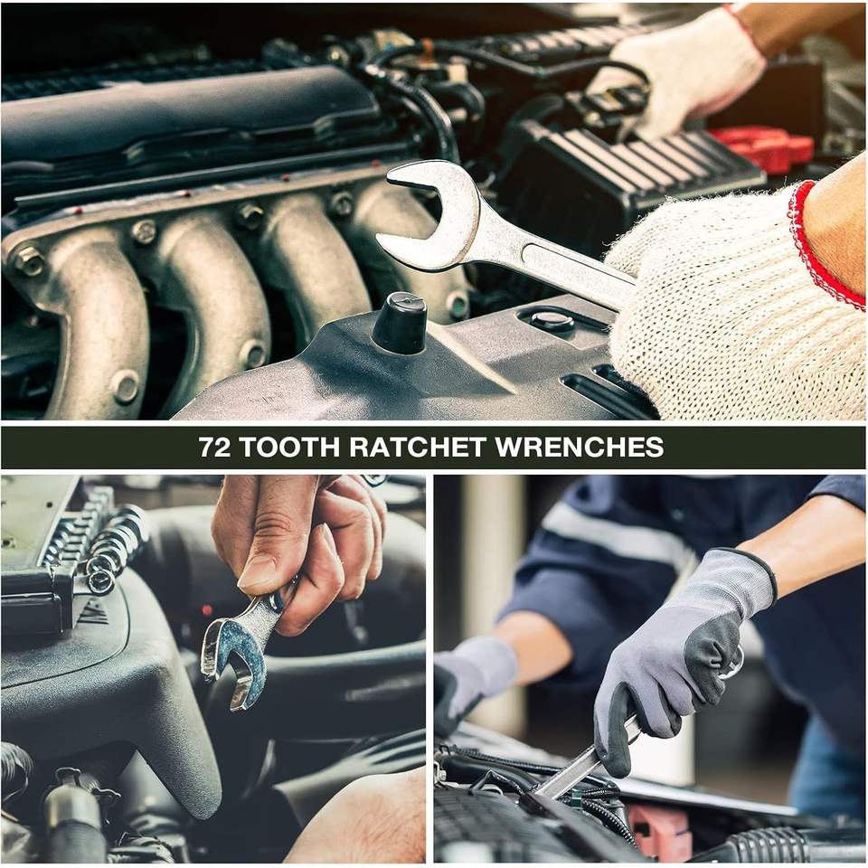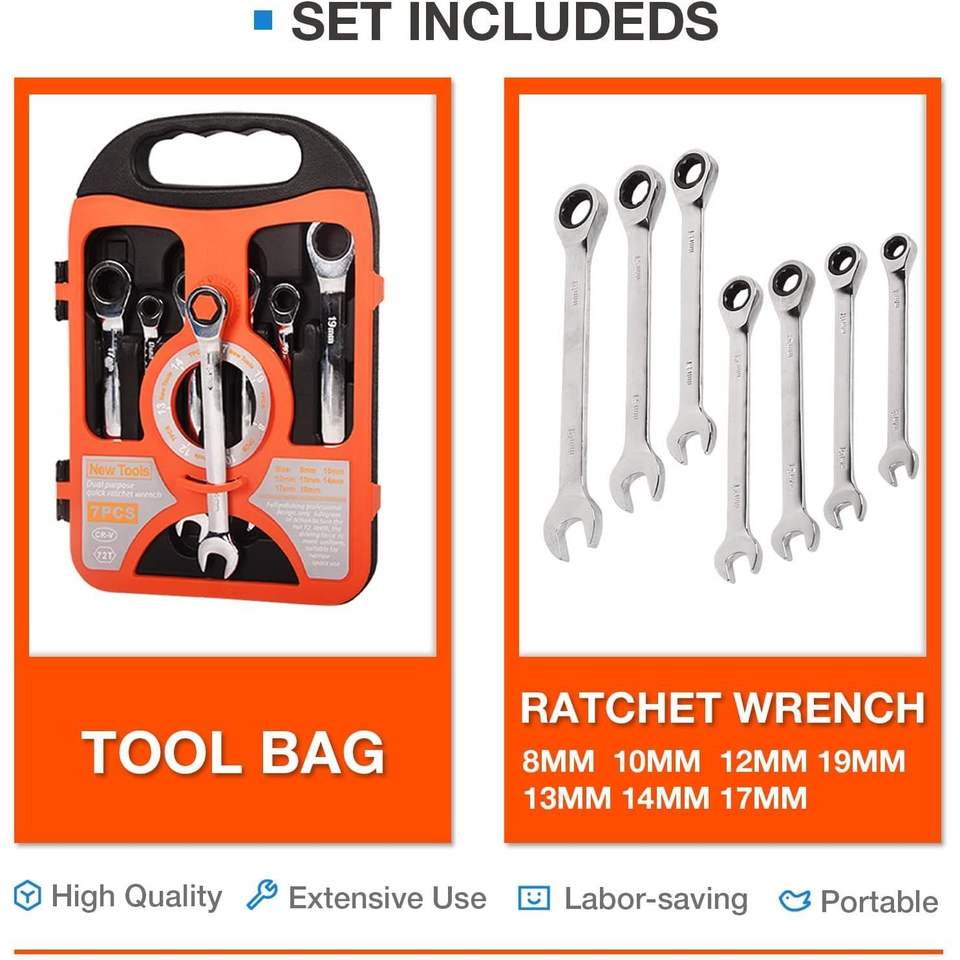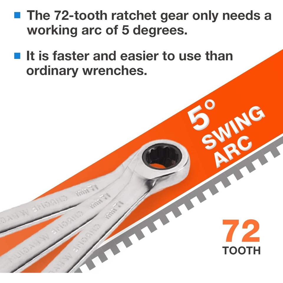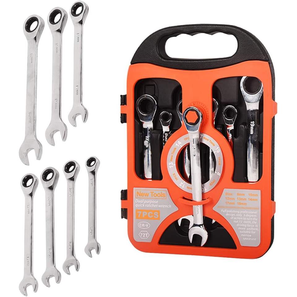7-Piece Ratchet Wrench Kit 8mm-19mm Chrome Vanadium Steel Full Polished 72 Tooth Standard Garage Tool Box Open End for Home