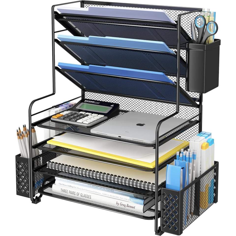 Organizzatore da scrivania a 7 livelli con vassoio portadocumenti, cestino sospeso in metallo e portapenne nero - Organizzatore di carta da ufficio di qualità