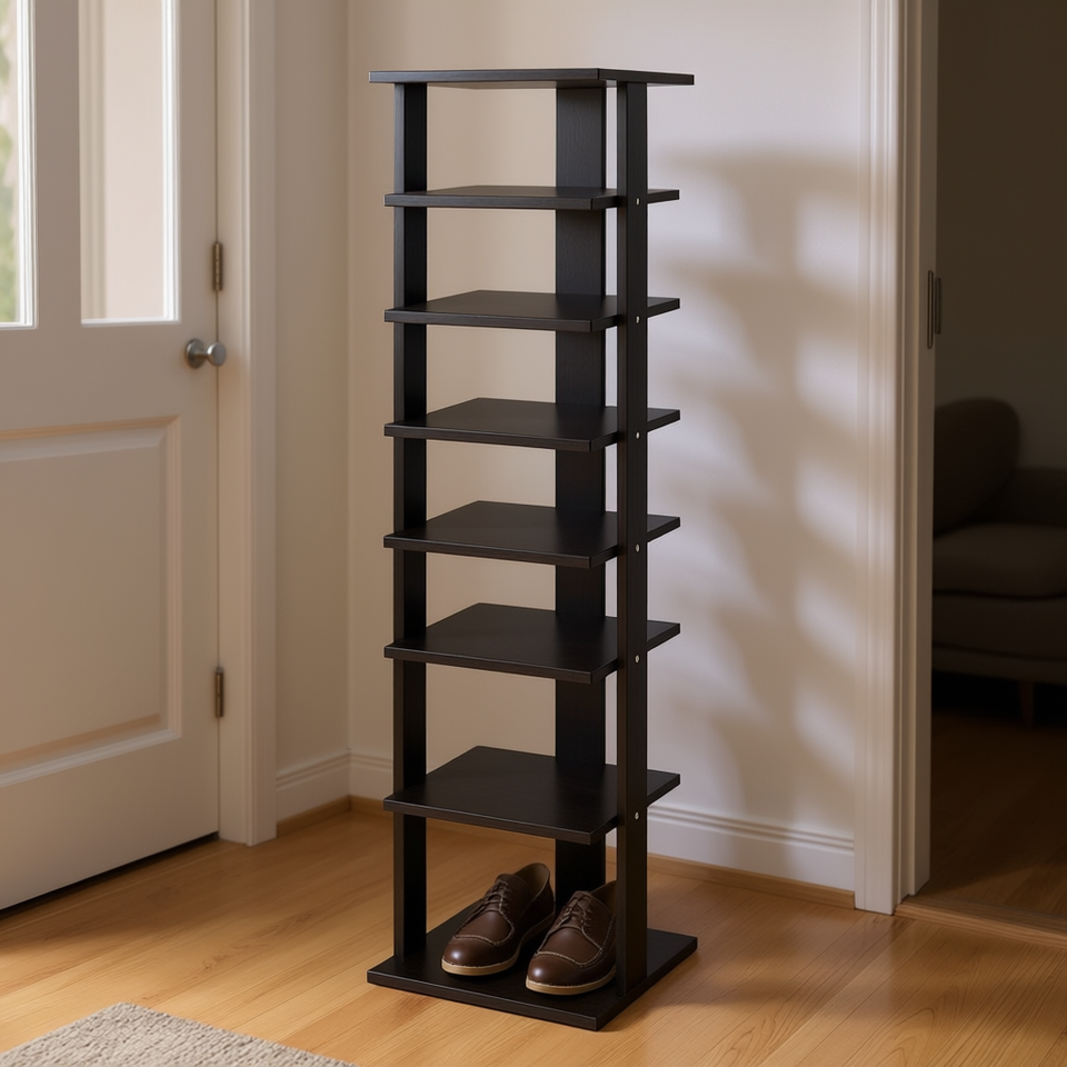 Scarpiera Verticale a 7 Livelli in Legno Nera, Design Moderno, Autoportante per Ingresso, Arredamento Casa