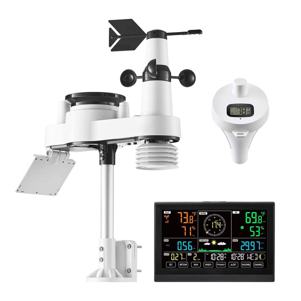Stazione Meteo Wi-Fi 7-in-1 con Display da 7.5 Pollici, Sensore Esterno Wireless ad Energia Solare, Termometro per Piscina, Pluviometro - Sistemi di Monitoraggio