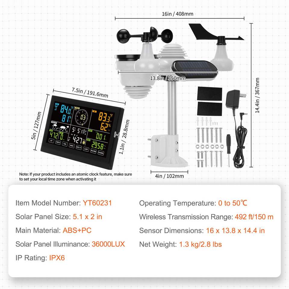 Stazione Meteo Digitale Wireless 7-in-1 con Display a Colori da 7,5 Pollici per Monitoraggio di Temperatura, Umidità e Velocità del Vento Interna ed Esterna