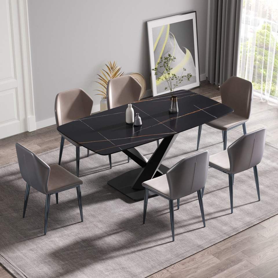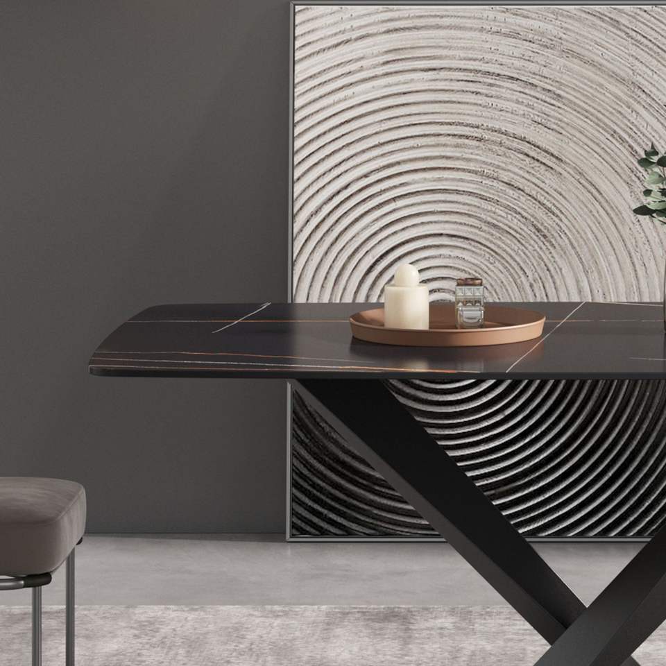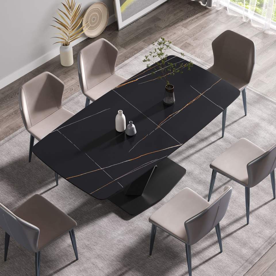 Tavolo da pranzo curvo moderno in pietra artificiale nera da 70,87 pollici con gamba in metallo per 6-8 persone