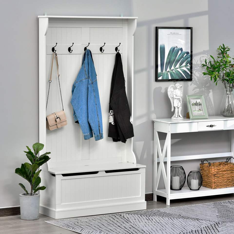 71 \ "3-in-1 appendiabiti albero con banco portaoggetti bianco ingresso Organizer