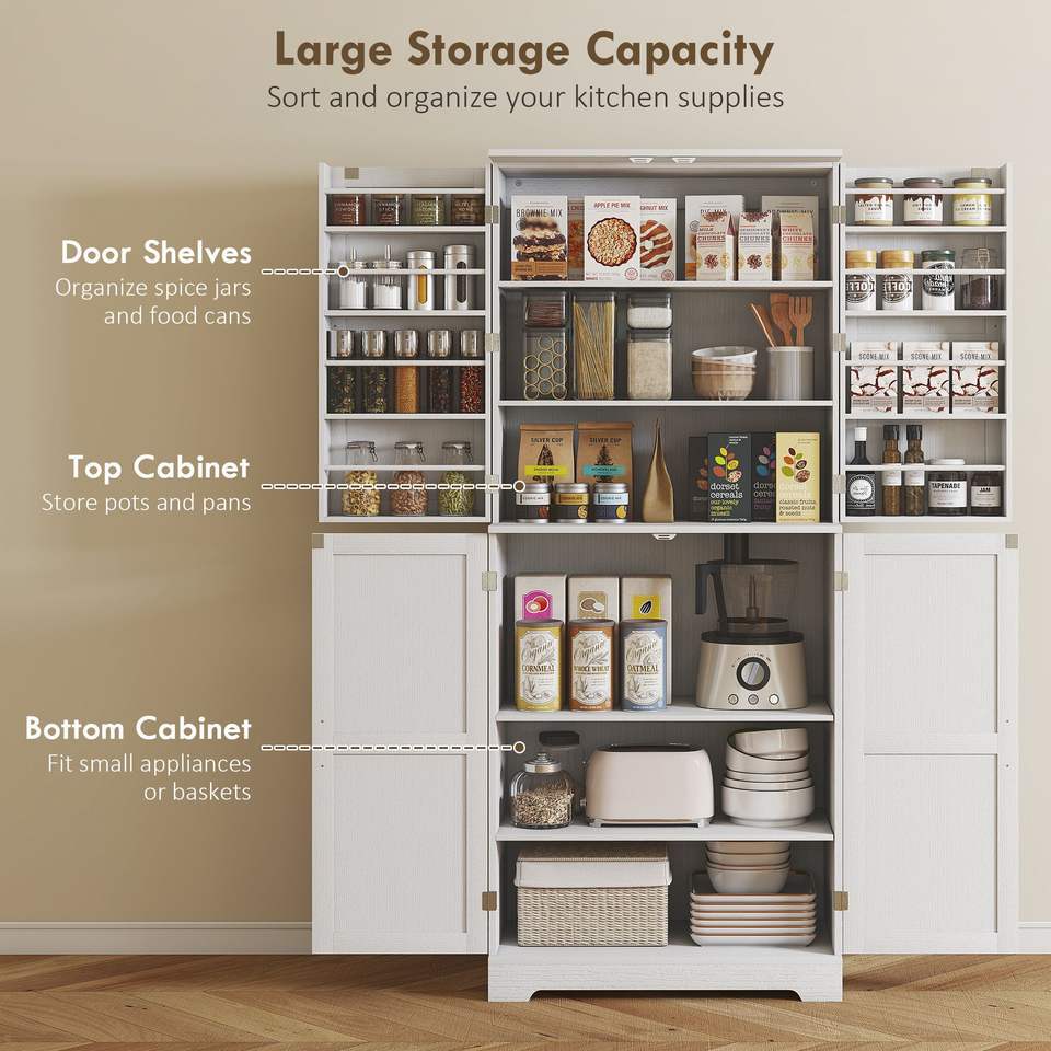 Armadio dispensa da cucina bianco stile rustico alto 183 cm con 4 ante scorrevoli, 4 ripiani regolabili e 8 ripiani per le ante.