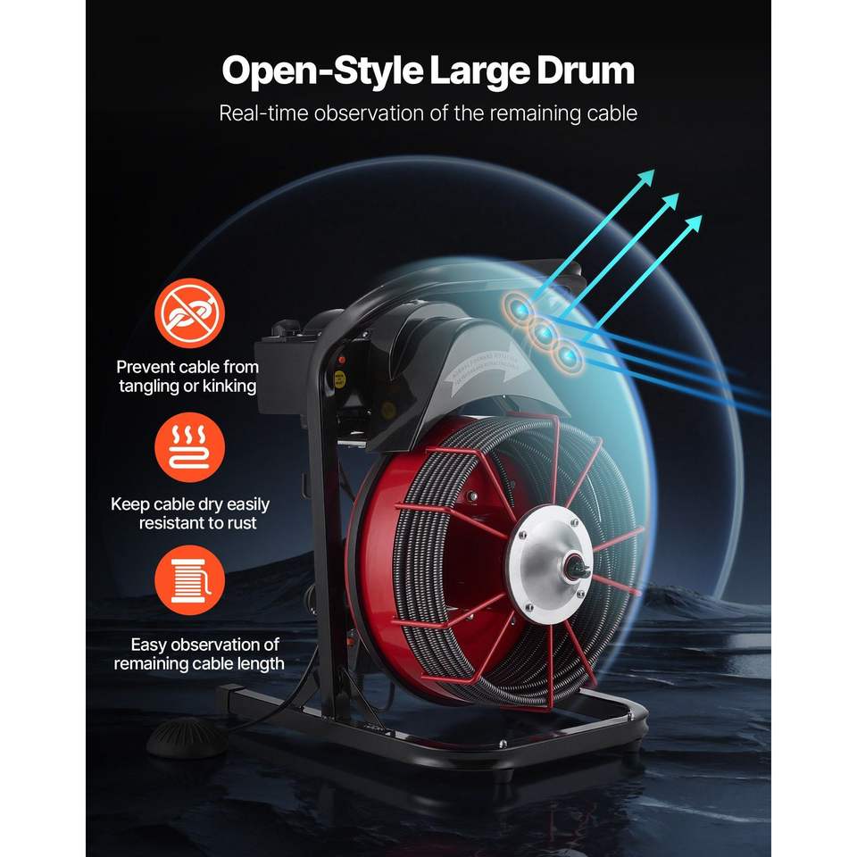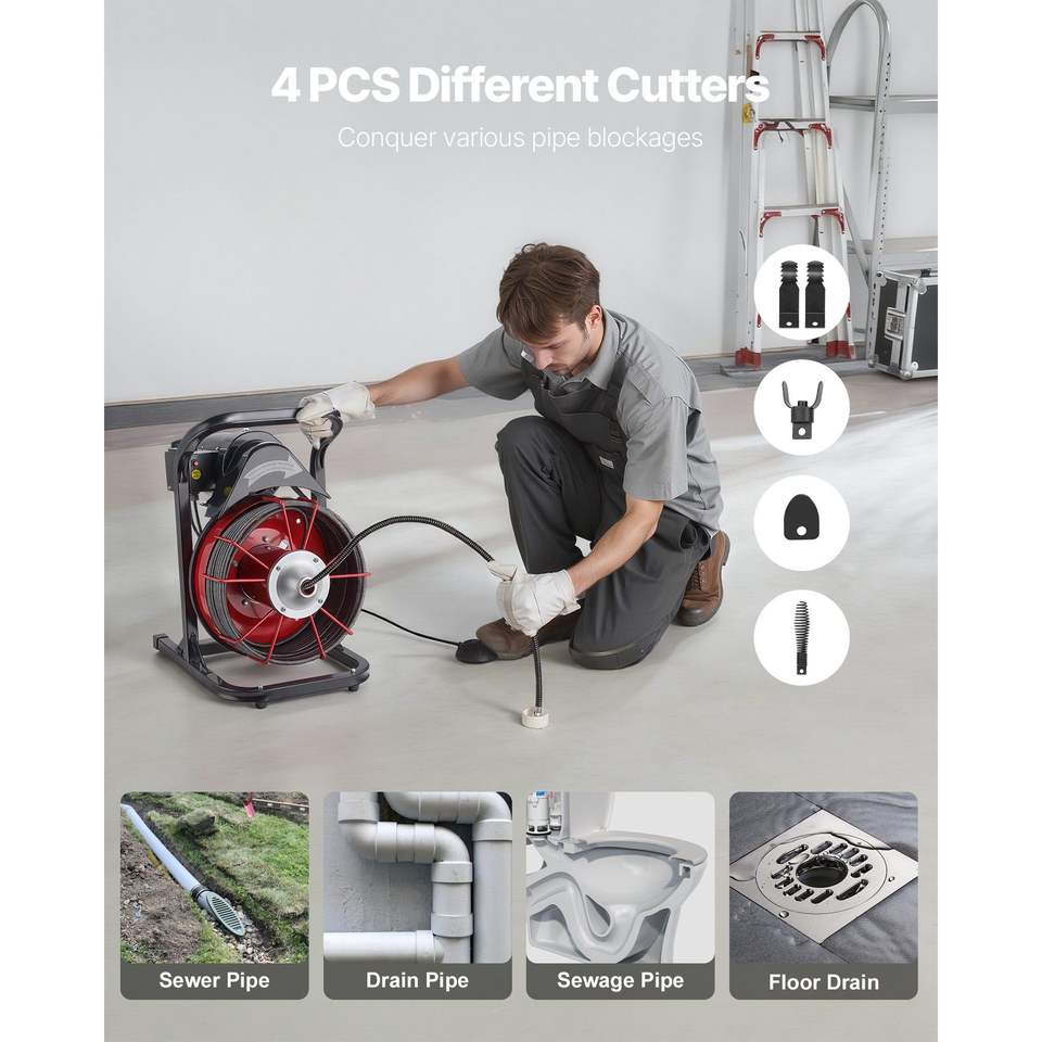 Sonda per la pulizia di scarichi con alimentazione manuale da 75 FT x 3/8 pollici, con 4 frese, attivazione ad aria, interruttore a pedale da 2-4 pollici, macchina per la pulizia di scarichi