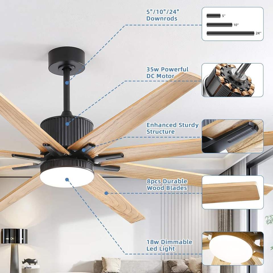 Ventilatore da soffitto a LED da 76 pollici con 8 lame in legno massello Luce telecomando dimmerabile 18W 8 lame in legno massello 18W luce LED dimmerabile