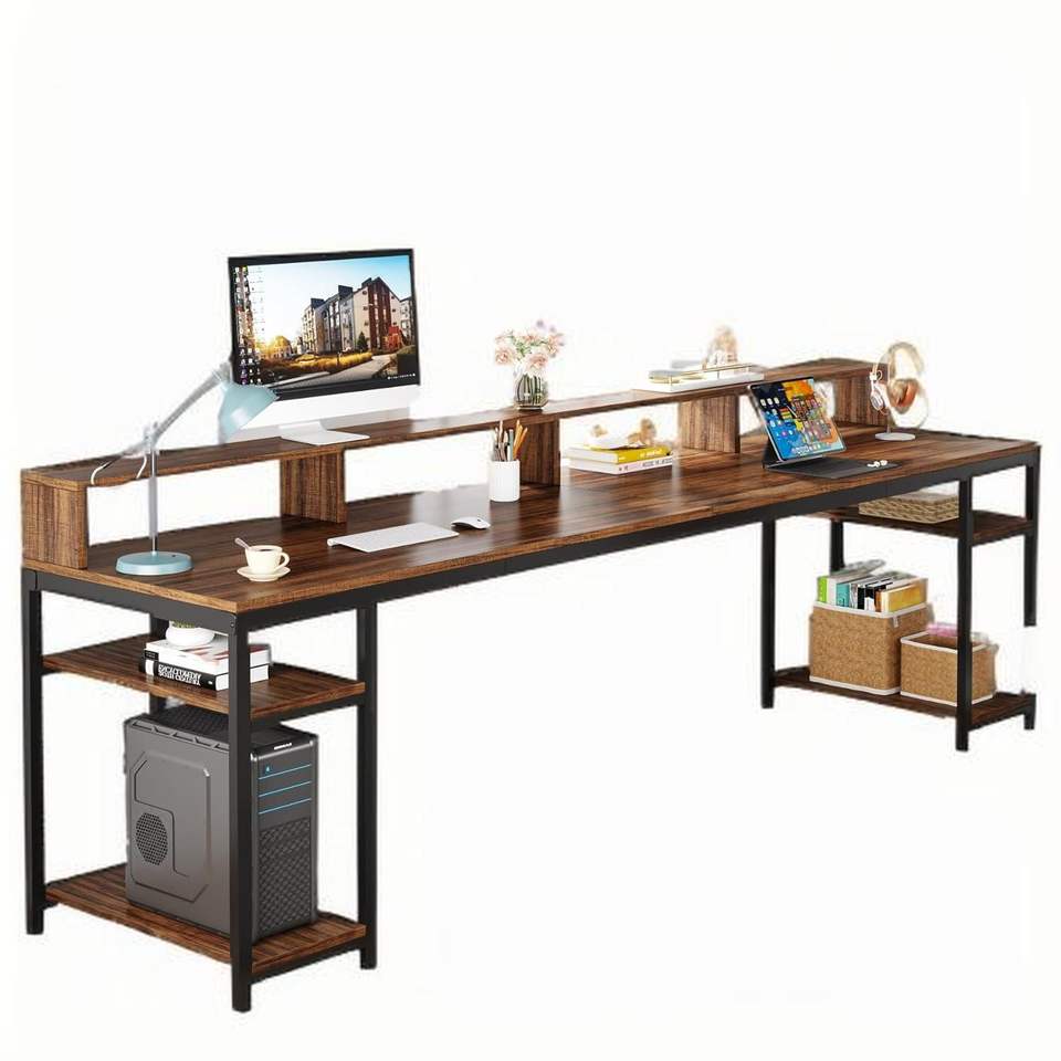 Scrivania doppia per due persone da 200 cm con ripiani portaoggetti, grande tavolo da ufficio, gaming e studio