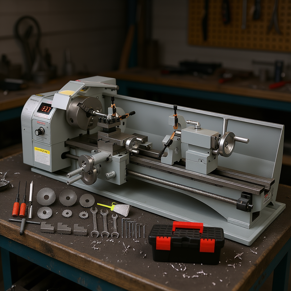 Mini Tornio Manuale per Metallo 220 x 750 mm 1100W con Schermo LED, Mandrino R8, 4 Postazioni Utensili, Lavorazione Leggera