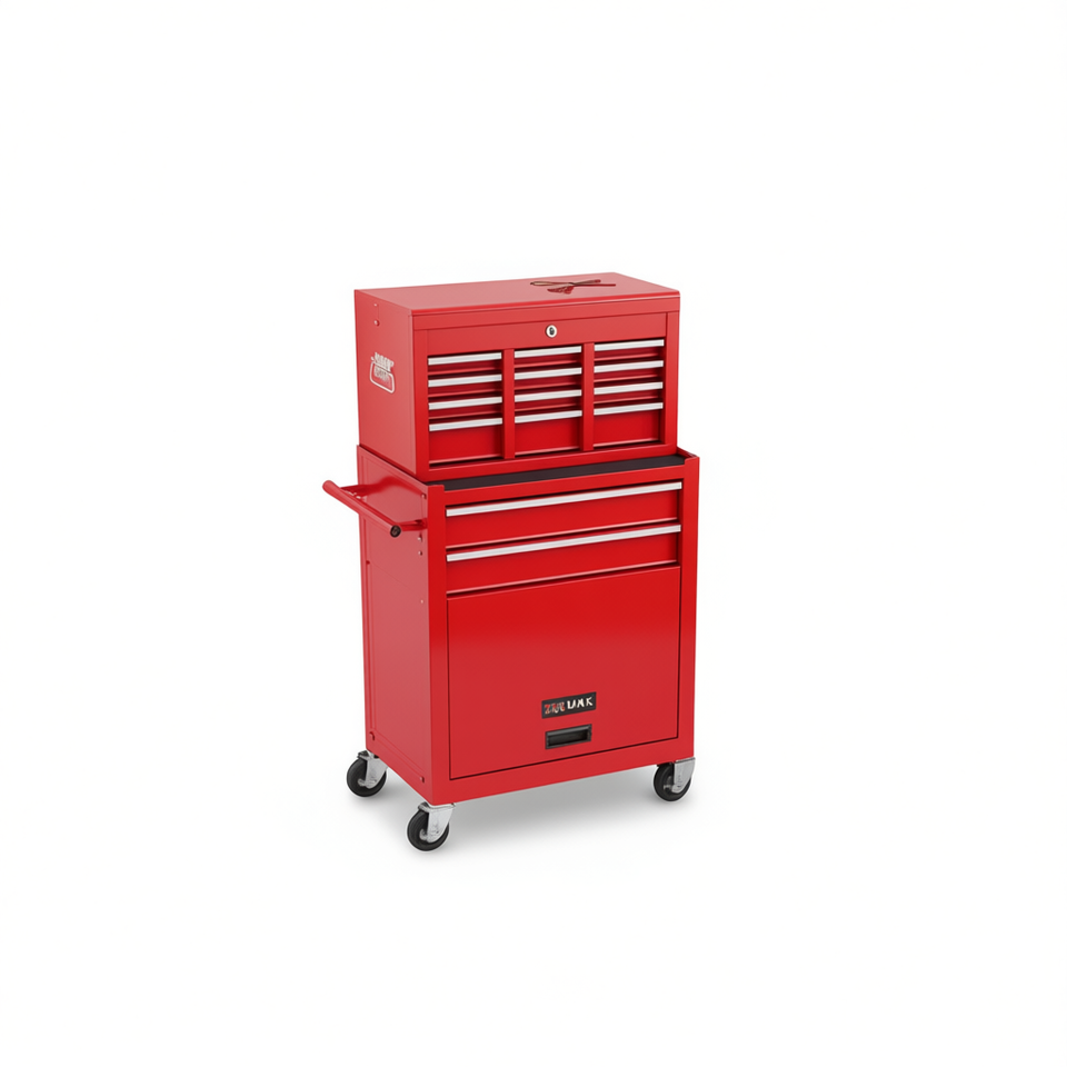Carrello Portautensili Rosso con 10 Cassetti, Armadietto Industriale in Ferro con Ruote, Serratura a Chiave, Maniglia a Spinta, Capacità 250 Kg