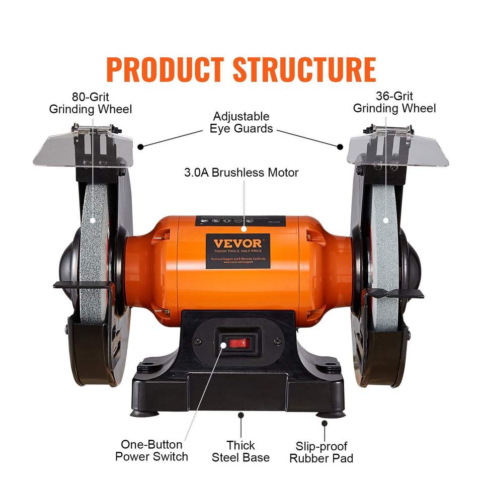 Smerigliatrice da banco a velocità singola da 8 pollici motore Brushless 3A 3580 RPM smerigliatrice da tavolo mole a 36/80 graniglia per affilatura