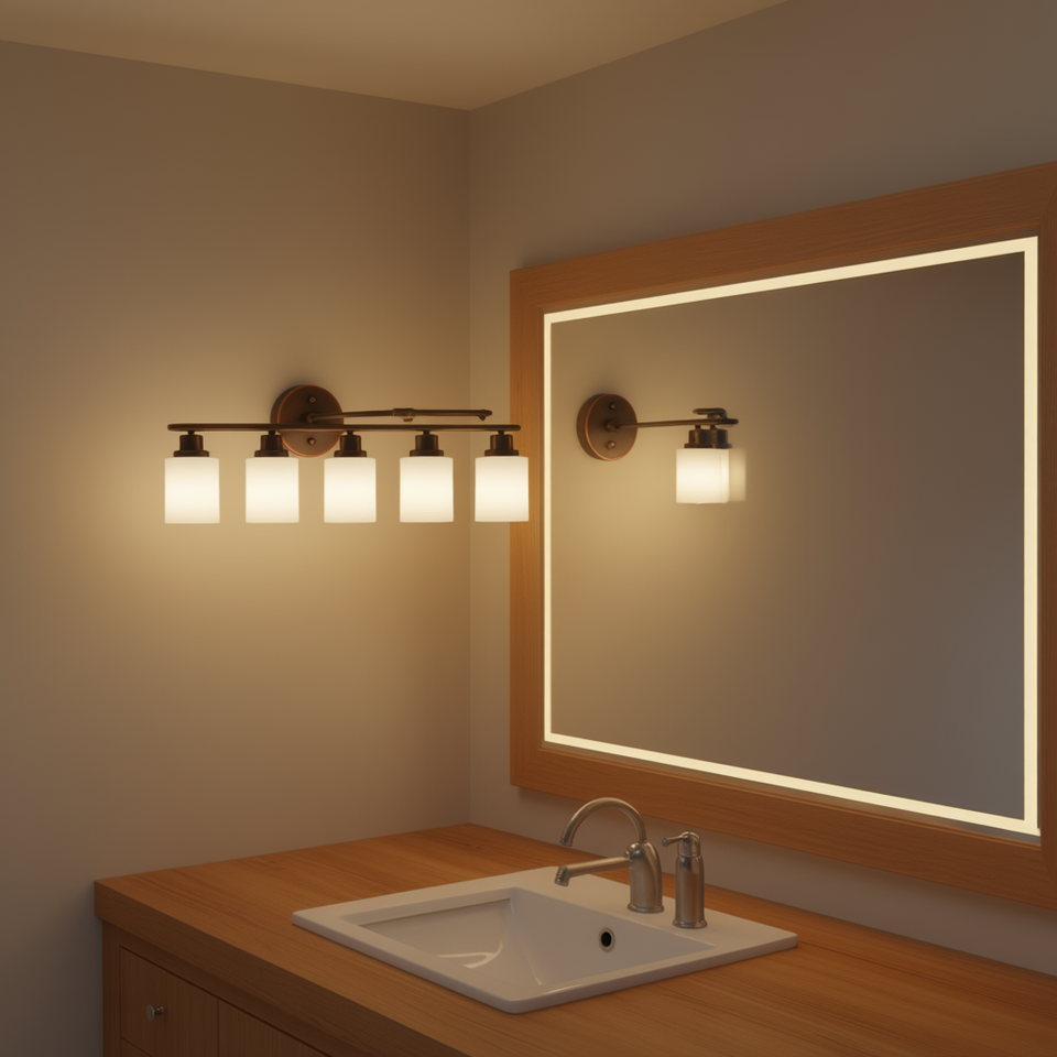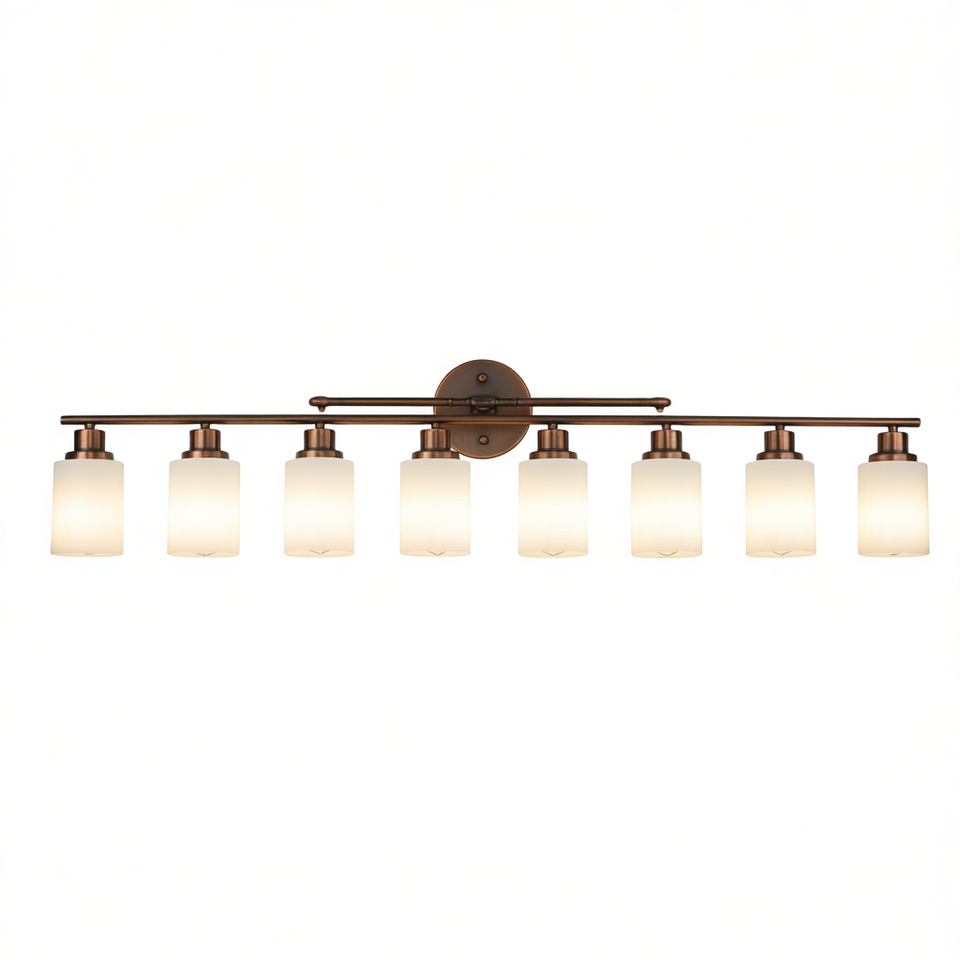 Applique da Parete Moderna a 8 Luci per Bagno, 52 Pollici, Finitura in Ferro Ramato, Vetro Satinato, Illuminazione LED Bianco Caldo
