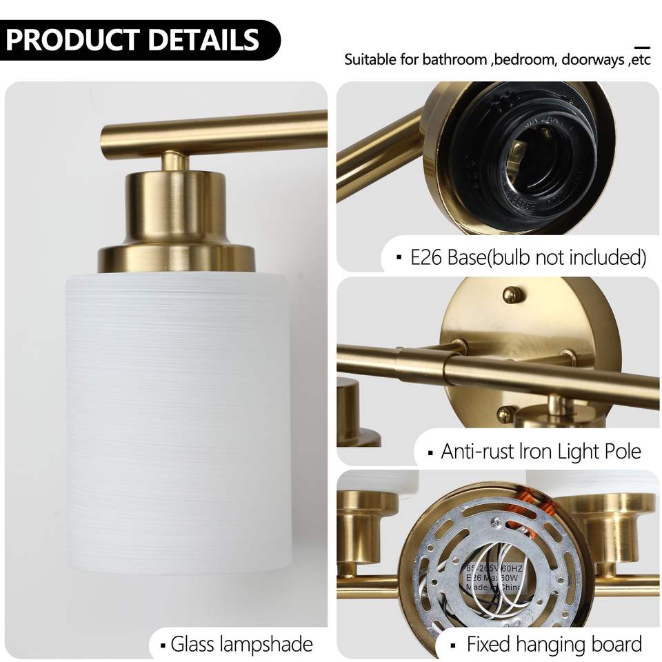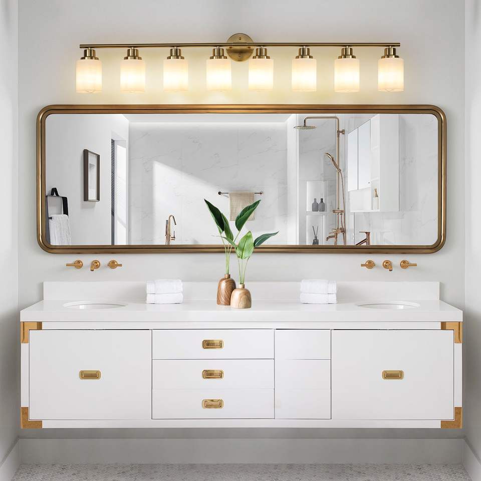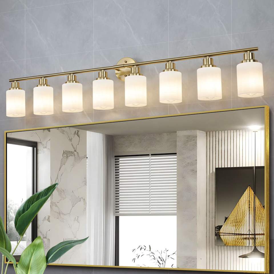 Applique da Parete Moderna a 8 Luci, 52 Pollici, Finitura Dorata con Paralumi in Vetro Satinato per Illuminazione Bagno e Corridoio, Lampadine Non Incluse