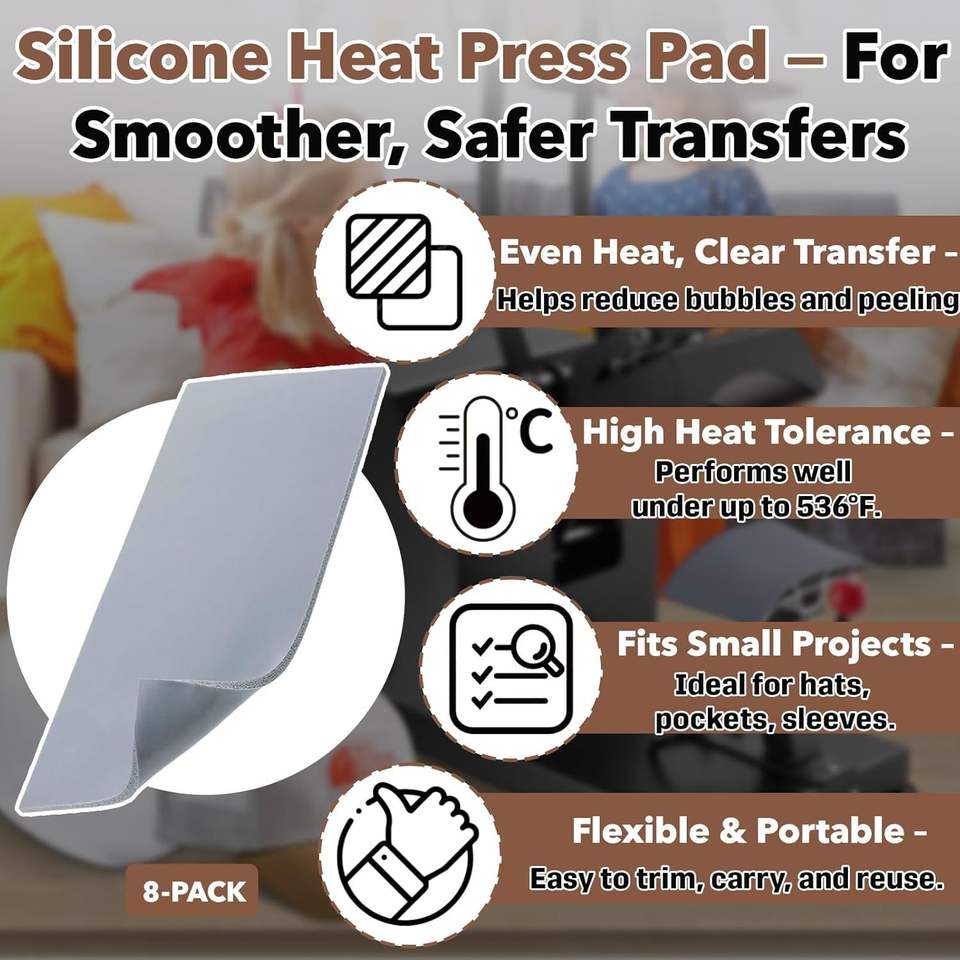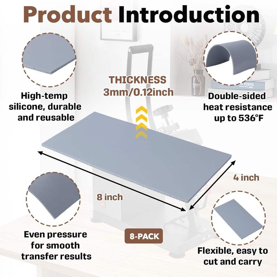 Set di 8 Tappetini in Silicone per Pressa a Caldo, Doppio Lato, 3,2 mm x 10 cm x 20 cm, Resistenti al Calore fino a 290°C, per Accessori di Abbigliamento