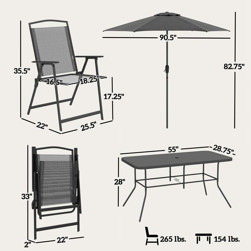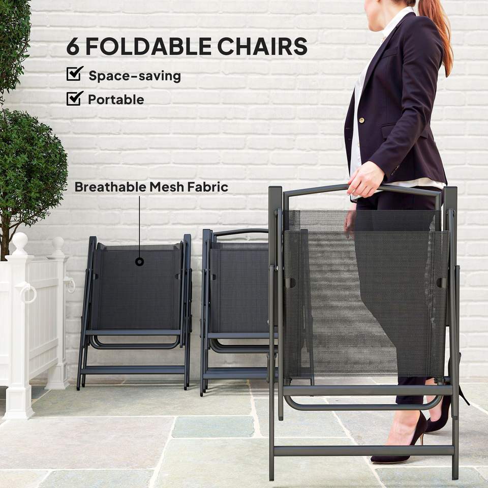 Set da Pranzo da Esterno Nero 8 Pezzi con Tavolo Rettangolare, 6 Sedie Pieghevoli e Ombrellone, Seduta in Rete per Arredamento Patio o Giardino