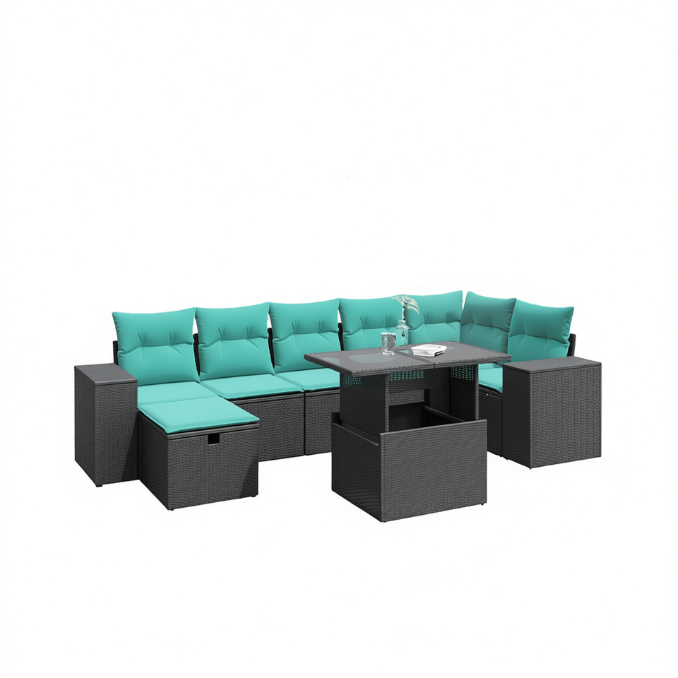 Set di divani da giardino in polyrattan nero da 8 pezzi con cuscini, mobili da esterno in stile contemporaneo
