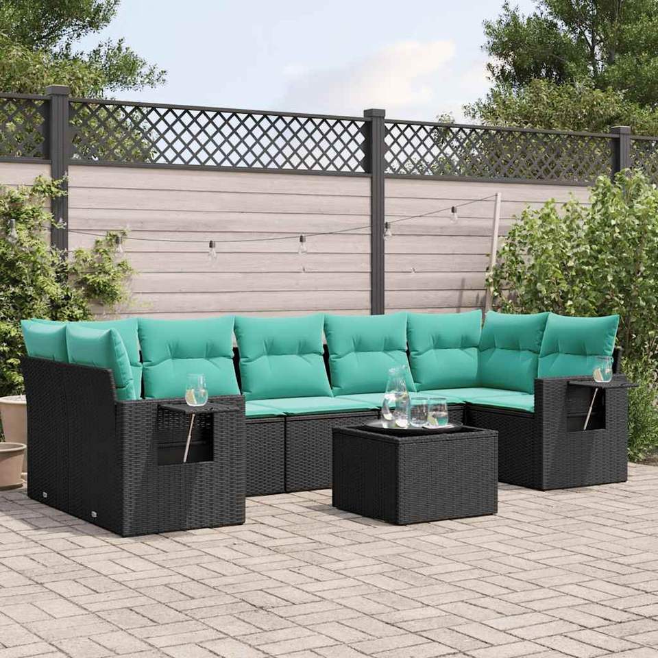 Set di divani da giardino in polyrattan nero da 8 pezzi con cuscini, mobili da esterno in stile contemporaneo