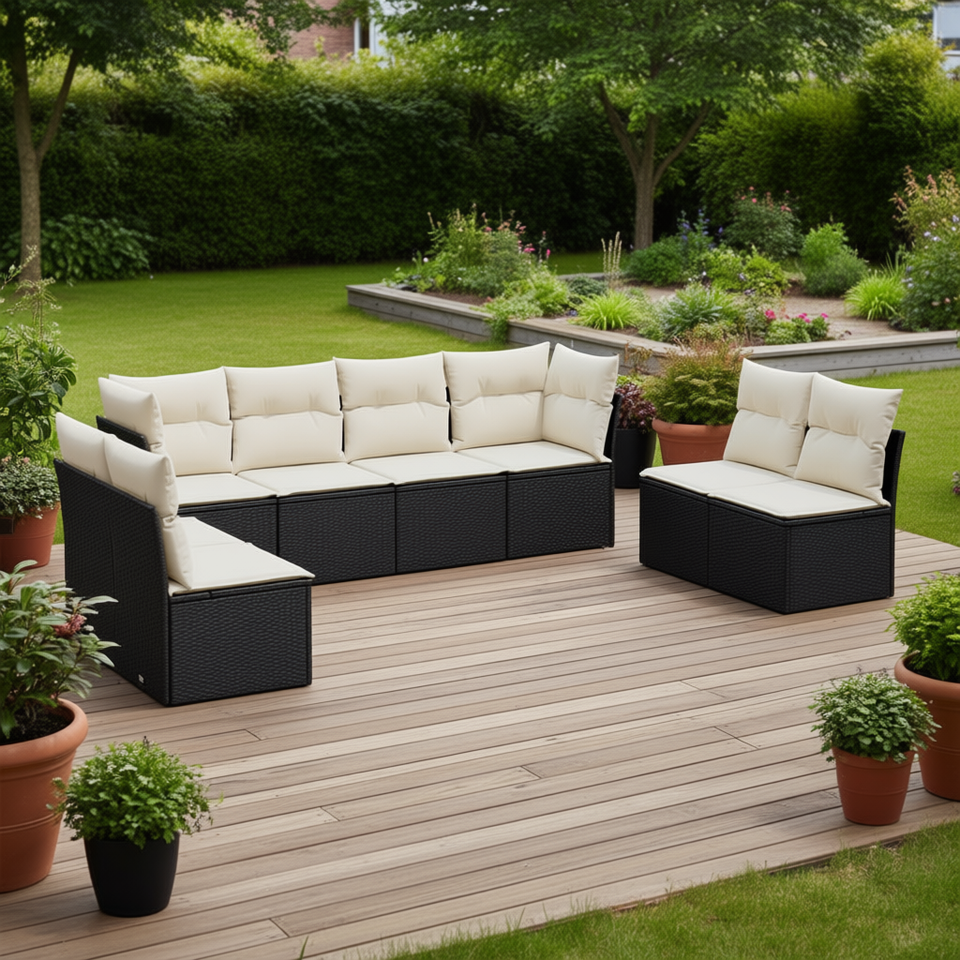 Set Divano da Esterno in Polyrattan Nero con Cuscini, 8 Posti, Stile Contemporaneo, Design Moderno