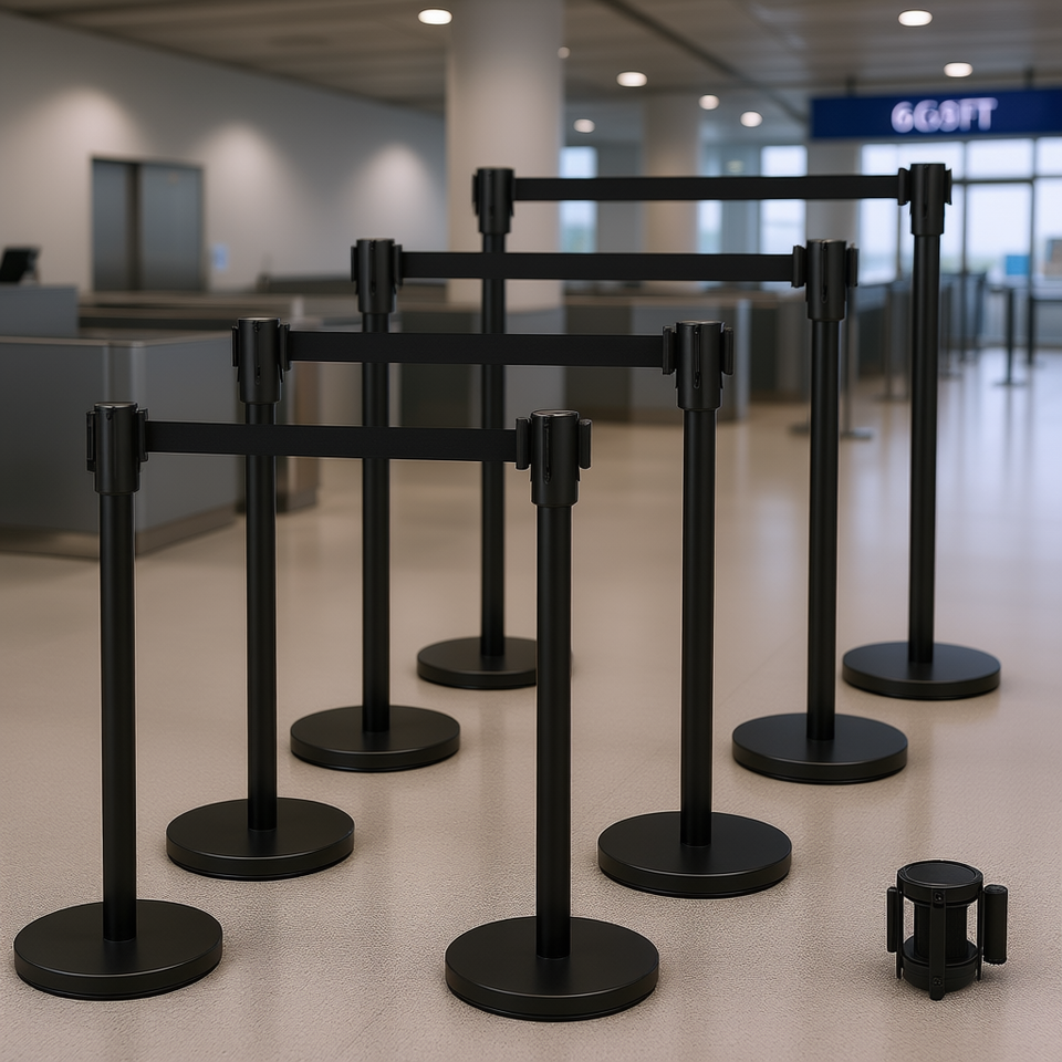 8 Piece Black Retractable Belt Crowd Control Stanchion Set Metal Base 6.6 Ft Access Control Barrier Easy Assembly