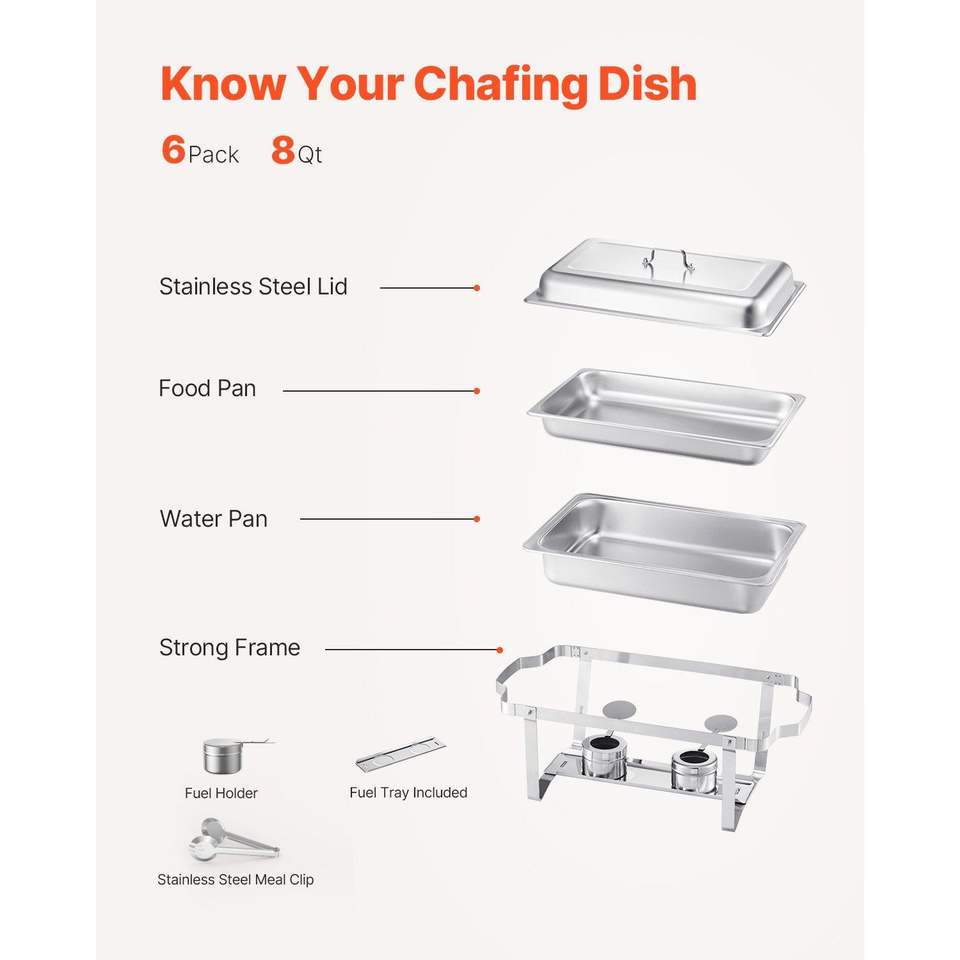 8 Qt Full Size Stainless Steel Rectangle Chafing Dish Set 6 Pack Buffet Warming & Holding Equipment