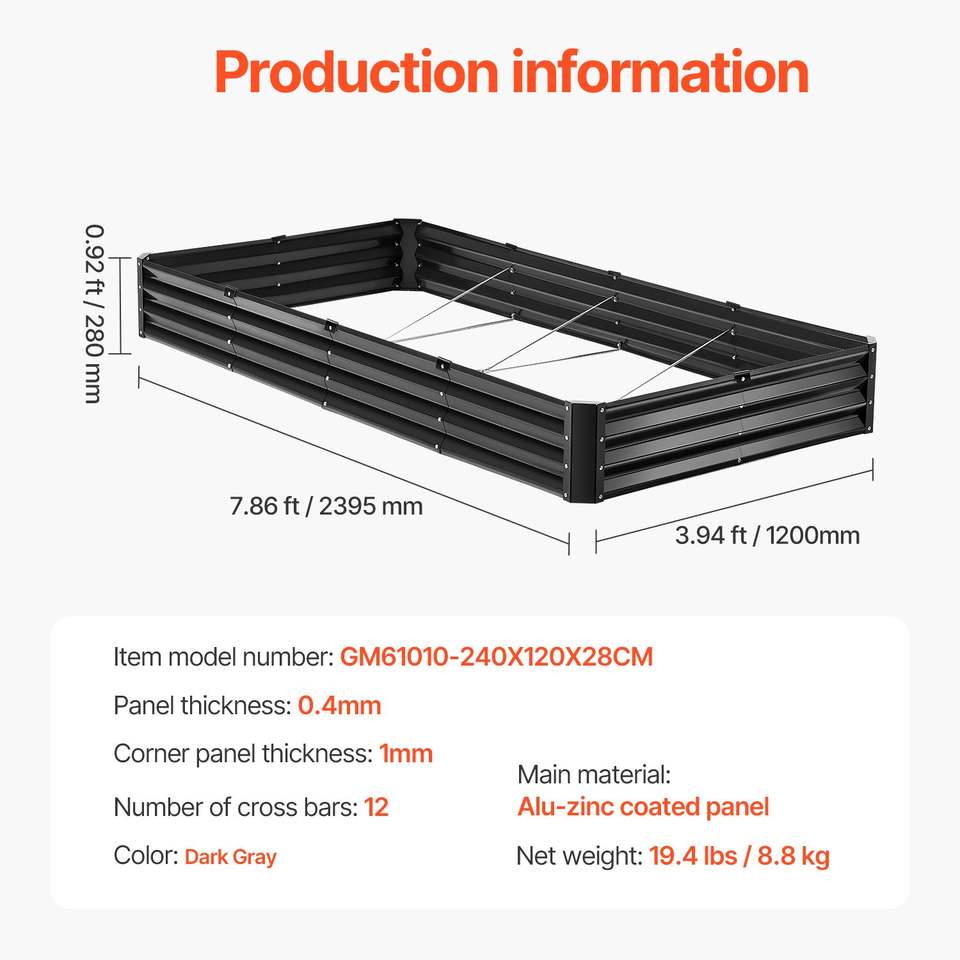 Fioriera Rialzata Grande da Esterno in Metallo Zincato 8 x 4 x 1 piedi con Fondo Aperto e Funzionalità Anti-Parassiti